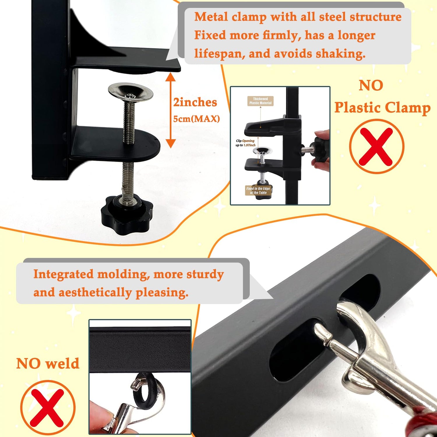 - 【Adjustable Dog Grooming Arm】You can adjust the dog grooming arm to your desired heights easily assisted, adjusted to height of Min 22” to Max 36” and the clamp fits tables with thickness of 2 inches and below.