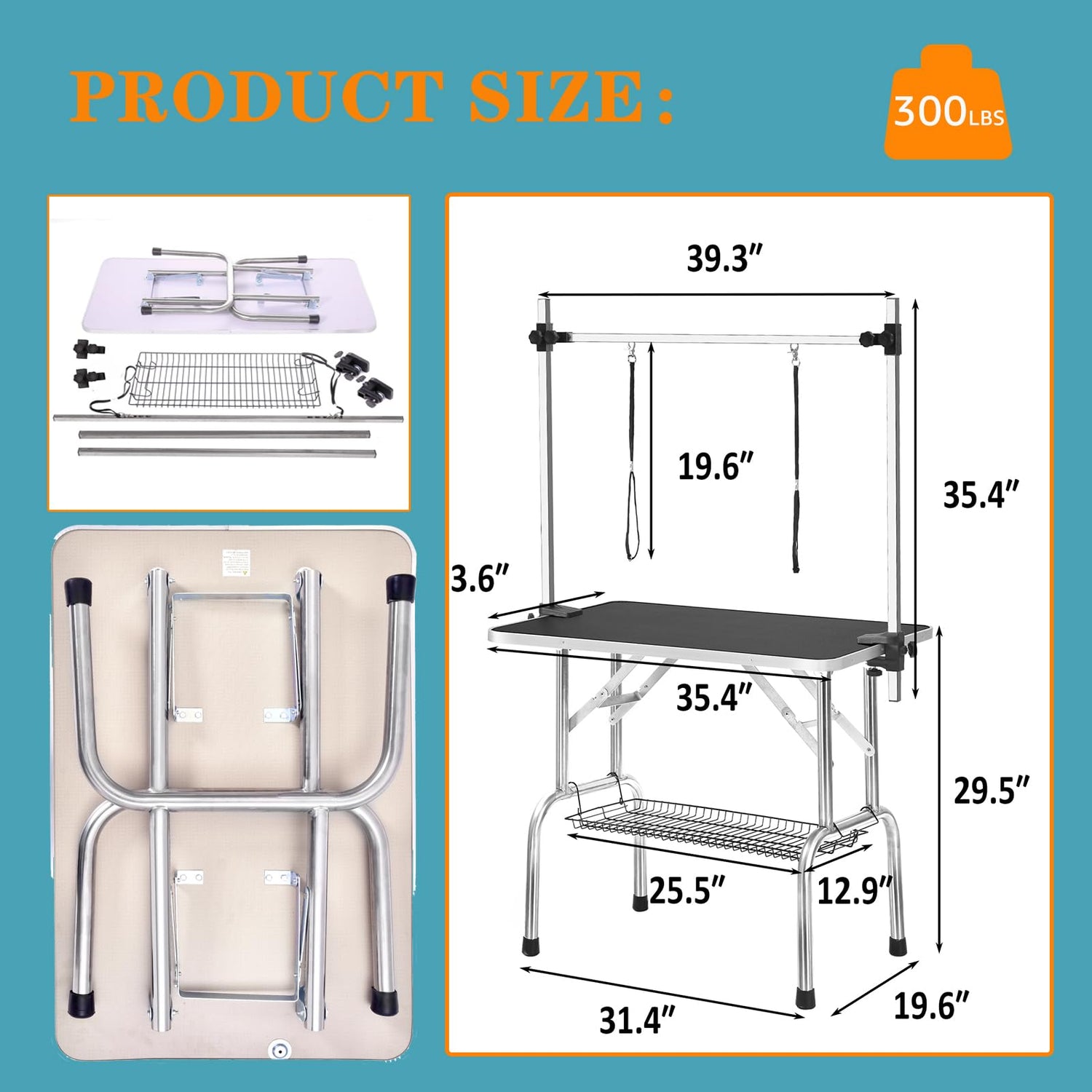 Details: Features: Top High quality Non-slip pure rubber matting , scrap resistant and easy to clean. Static-free board so hair and debris do not stick and can be easily cleaned and wiped down. Waterproof 7-Layer sealed to stop damp entering the plywood top for a long trouble free use. Deluxe aluminum edging. featured design support brackets so will take the heaviest of dogs. Steel reinforced rubber caps make the table ultra stable. Heavy Duty Stainless steel Folding Legs,will not rust or corrode like chrome. Folds for easy storage and can easily be carried so ideal for mobile groomers etc. Will take the heaviest of dog with out a problem due to the design support brackets and heavy duty folding leg. Description: Color: Black Table Dimension: 36''X 24'' X 0.8'' (L X W X Thickness) Whole Unit Dimension: 36''X 24''X 64''(L X W X H) Size Of The Mesh Tray: 25.6''X 12.6''(L X W) Material: Stainless Steel Frame And Anti-slip Rubber Table Surface Length of Noose:20.5'' Unit Weight: 33 Lbs Weight Capacity: 330 Lbs Package Includes: 1 X Grooming Table 2 X Adjustable Arm 1 X Adjustable Overhead Arm 2 X Noose 1 X Mesh Tray