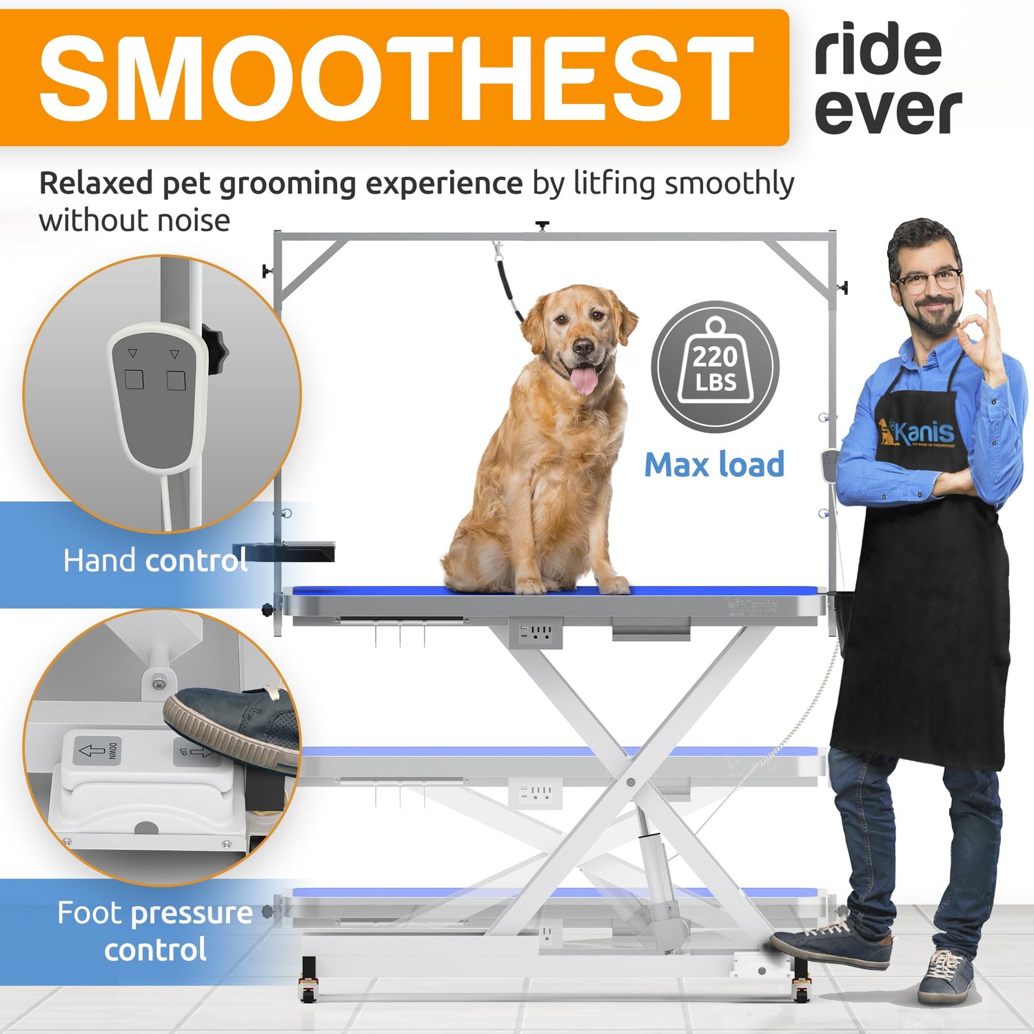 • READY TO USE - PLUG AND PLAY - KANIS offers Superior Performance, Durable, and Reliable Dog Grooming tables that facilitate grooming, brushing, trimming, dressing, and drying for all kinds of large, medium, and small pets. With a lift capacity of 220lbs and easy access to all pet grooming equipment, our electric lift grooming table is the perfect partner for any professional or home groomer.