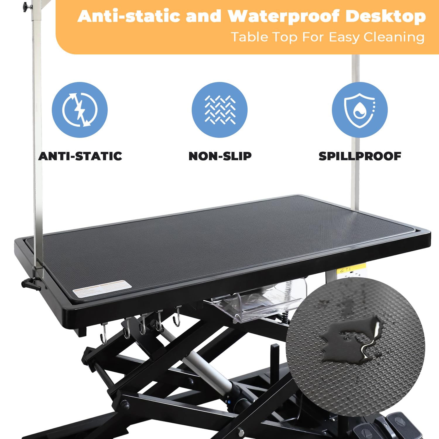- [Non-Slip Rubber Tabletop] Our tabletop is made of high-quality anti-static rubber, which is anti-skid, corrosion-resistant and easy to clean. The round edge can prevent damage or injury. Table Dimension: 50" x 26.7". The tabletop can accommodate all puppies, medium and large dogs like poodles, labradors, dachshunds, huskies and other pets.