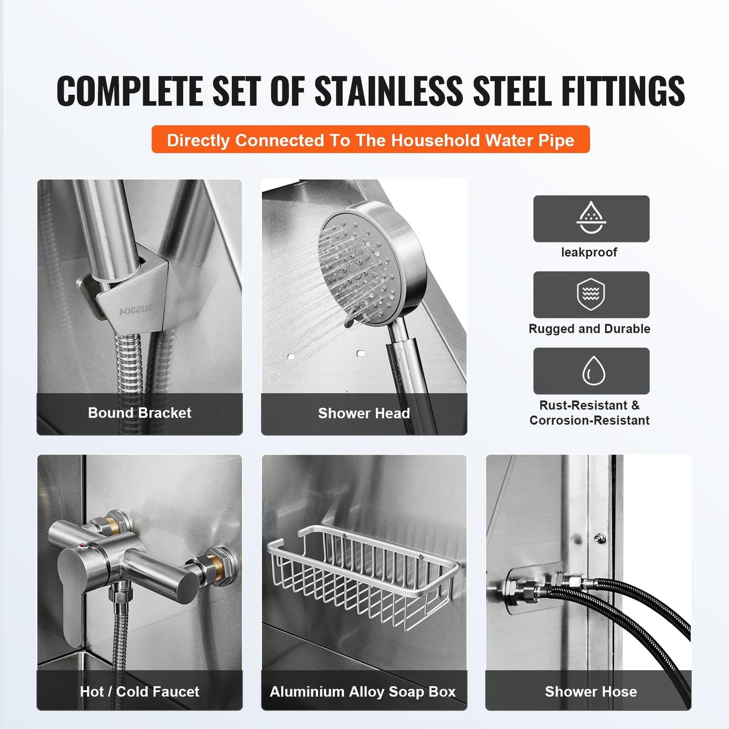 - Stainless Steel Accessories: Equipped with a showerhead, faucet, and stainless steel support frame that can be connected directly to the household hose. They are rust-resistant and durable. An additional aluminum alloy soap dish is included for long-lasting use.