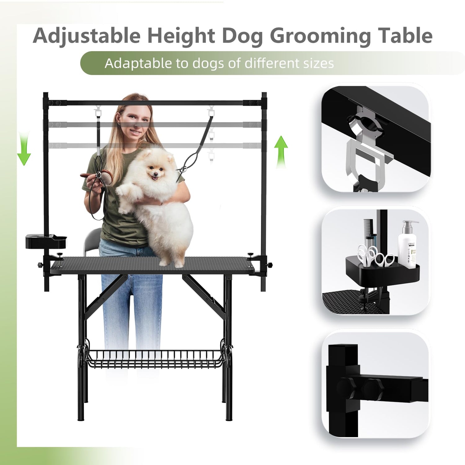 VFK 36''/47''Large Dog Grooming Table, Foldable Pet Station at Home, Dog Grooming Table,Adjustable Cat Drying Desktop with Arms, Nooses, Mesh Tray (Basic pet Table, 36" Black)