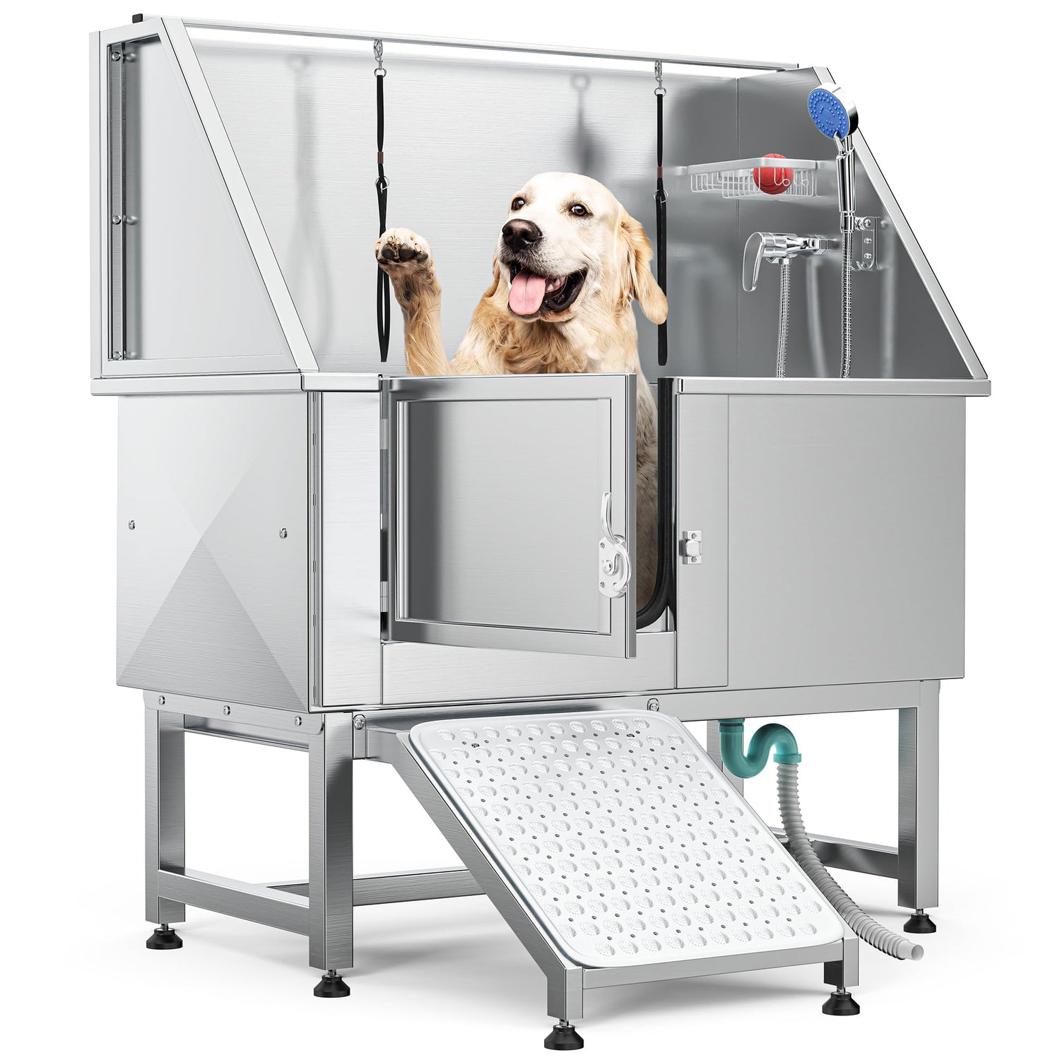 YITAHOME 50" Dog Grooming Tub 304 Stainless Steel Professional Dog Bathing Station w/Ramp, Floor Grate, Faucet, Dog Bathtub for Large, Medium, Small Pets Left Door, Dog Washing Station for Home