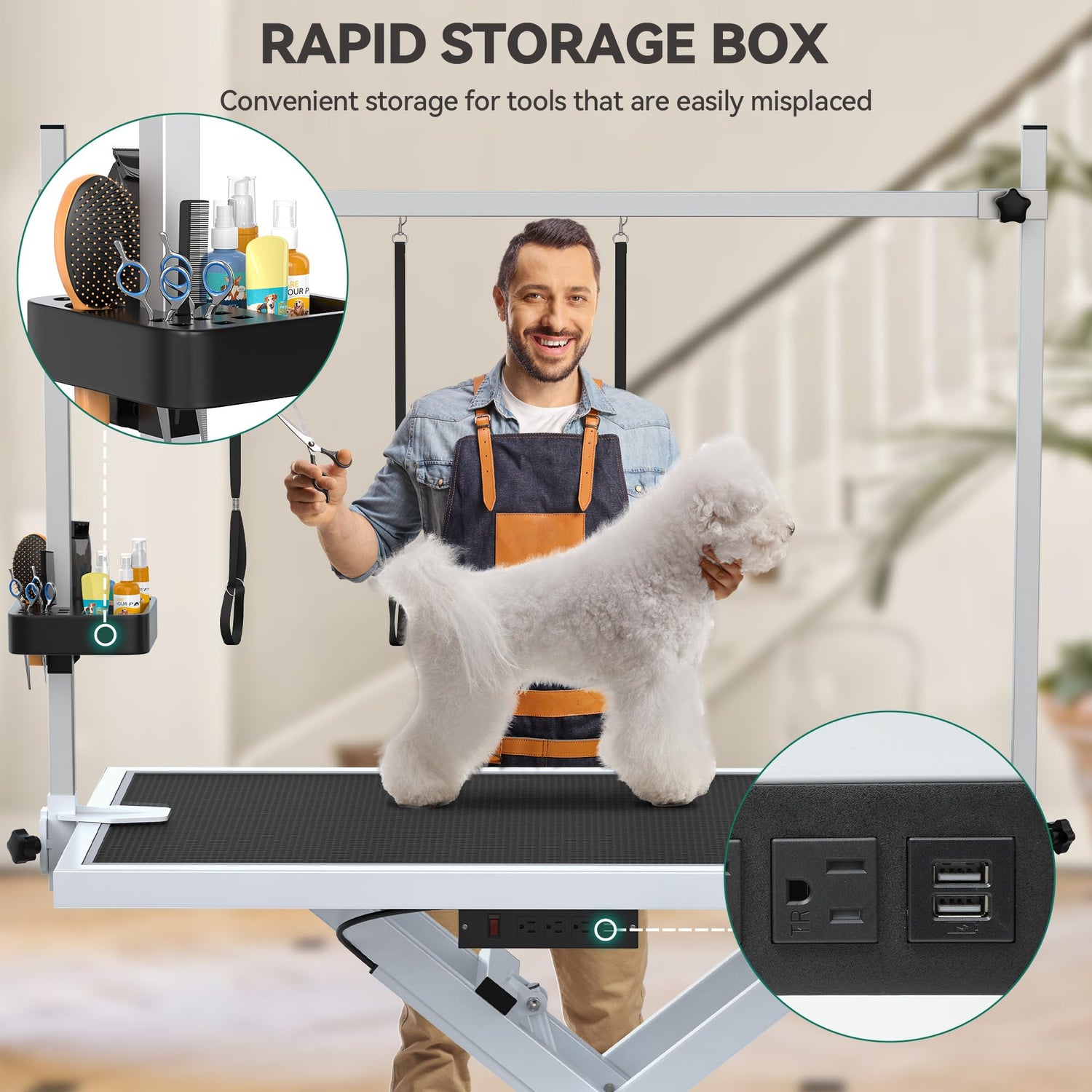 - Multifunctional Design: As the ultimate grooming solution, this grooming table for dogs offer a portable storage box to keep beauty tools at hand and tidies up the beauty area so beauticians can focus on their craft; AC outlet and USB port add-ons offer easy access to grooming equipment