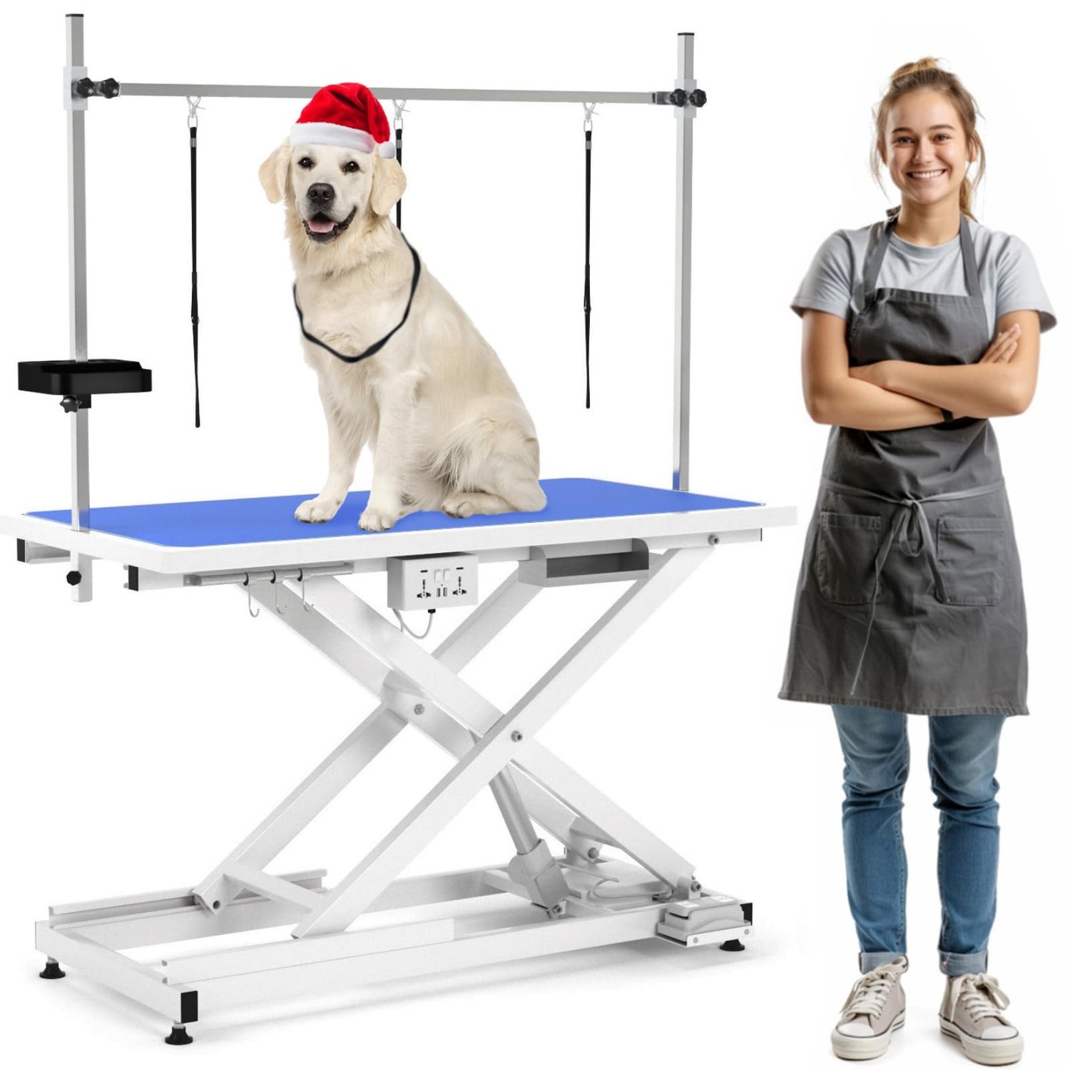 - For Small/Medium/Large Pets: Tabletop Dimension: 49" x 26". The table adopts H-shaped arm design that adjusts in height by knobs to accommodate various pets sizes, can accommodates poodles, labradors, golden retrievers, and every breed in between, and even cats. Our electric lift grooming table will be a good partner for any professional or home groomer