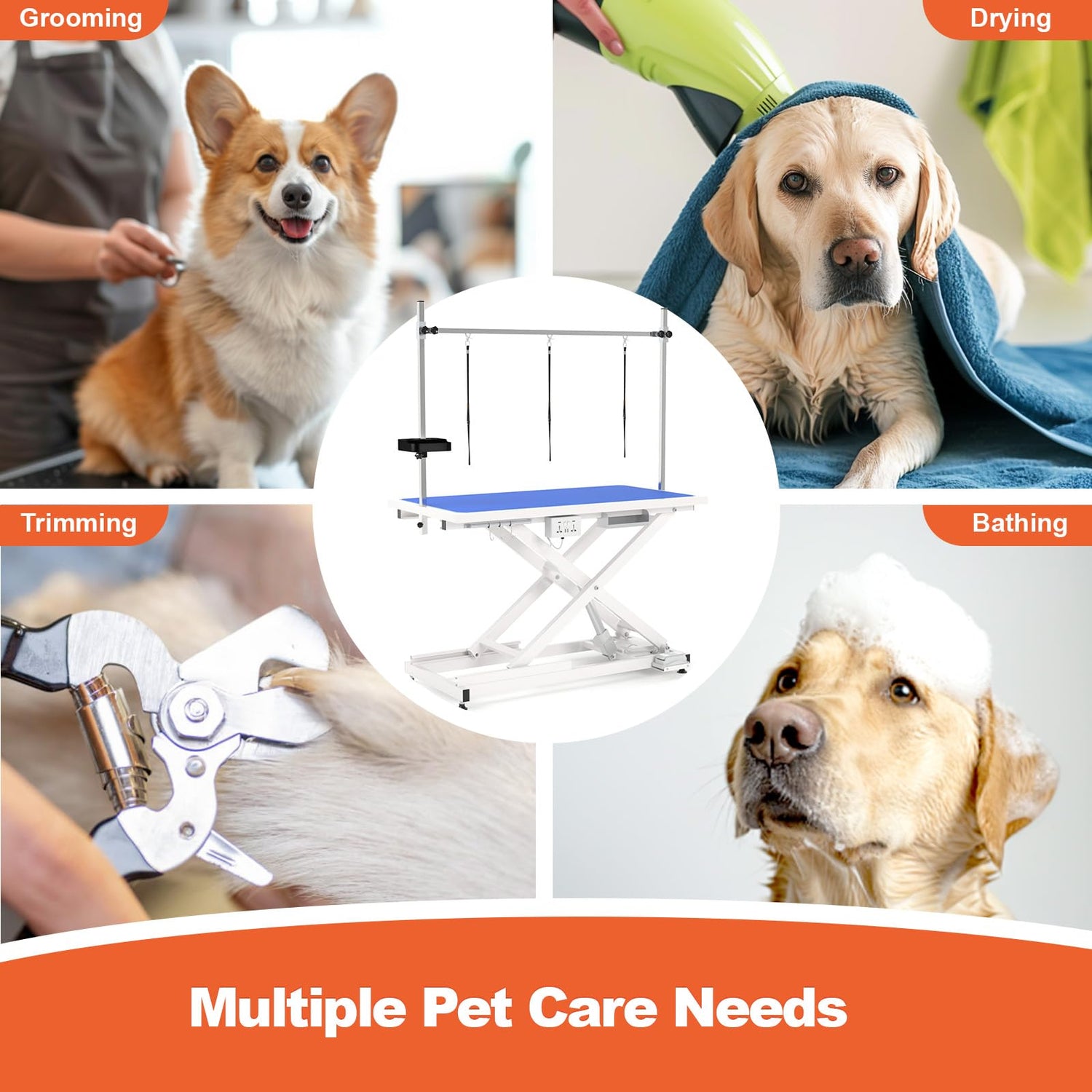 - One-touch Lift Height Adjustable: X-lifting design, easily adjust height by foot pedal range from 6.7'' - 36.6" to suit different tasks, move up and down really quiet and fast, allowing for optimal grooming positioning. The lower height convenient for large or old pets to get on & off. The maximum height of 36.6" will help you work comfortably and avoid back pain