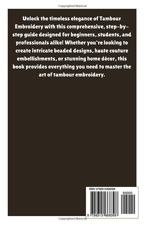 Details: Unlock the timeless elegance of Tambour Embroidery with this comprehensive, step-by-step guide designed for beginners, students, and professionals alike! Whether you're looking to create intricate beaded designs, haute couture embellishments, or stunning home décor, this book provides everything you need to master the art of tambour embroidery.