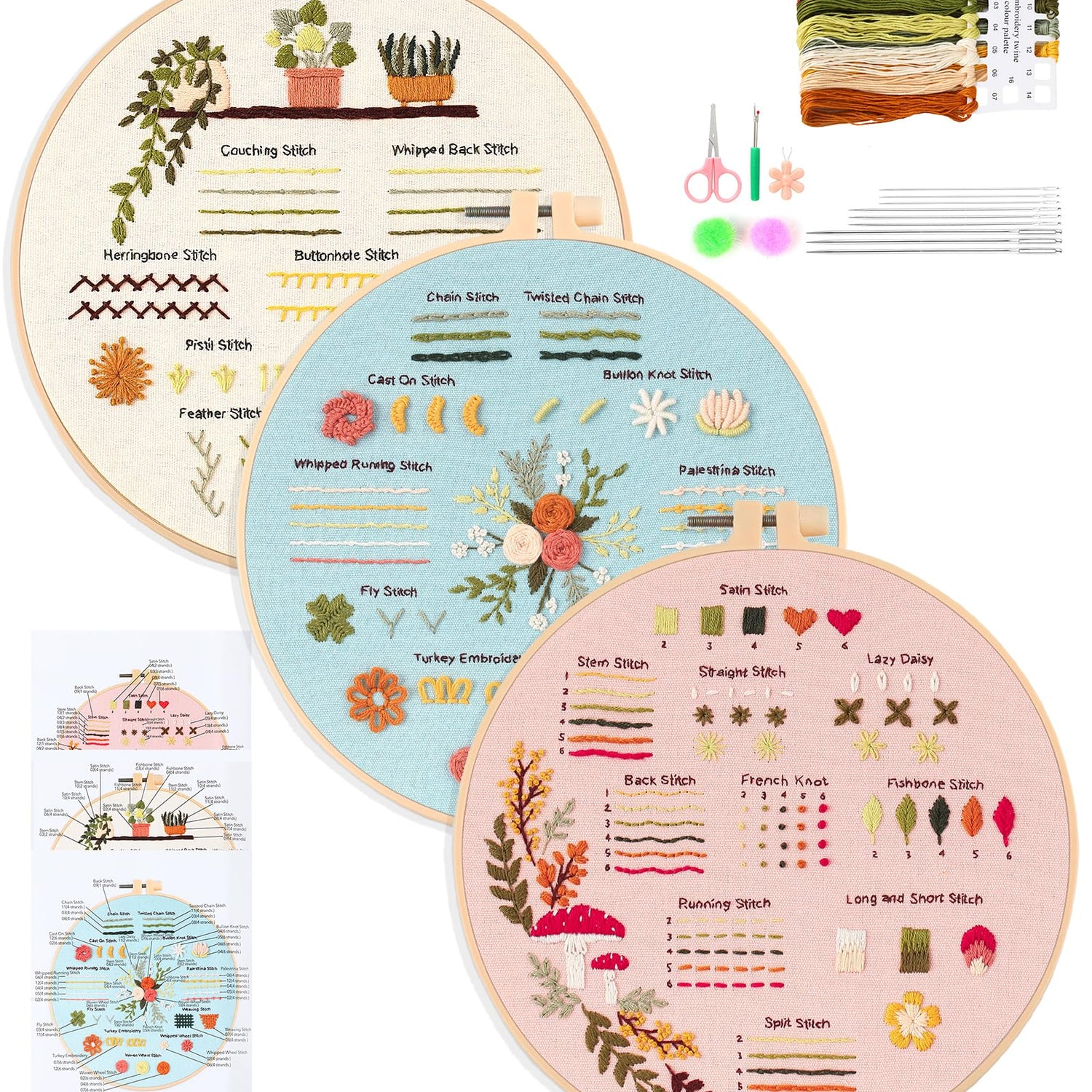- All-in-One Beginner Embroidery Kit – Learn Fast!: Get started with our comprehensive embroidery starter kit for adults. This set includes three stamped DIY cross-stitch kits complete with cotton fabric, embroidery floss, hoop, and detailed step-by-step instructions. Perfect for beginners to learn hand stitching quickly and easily.