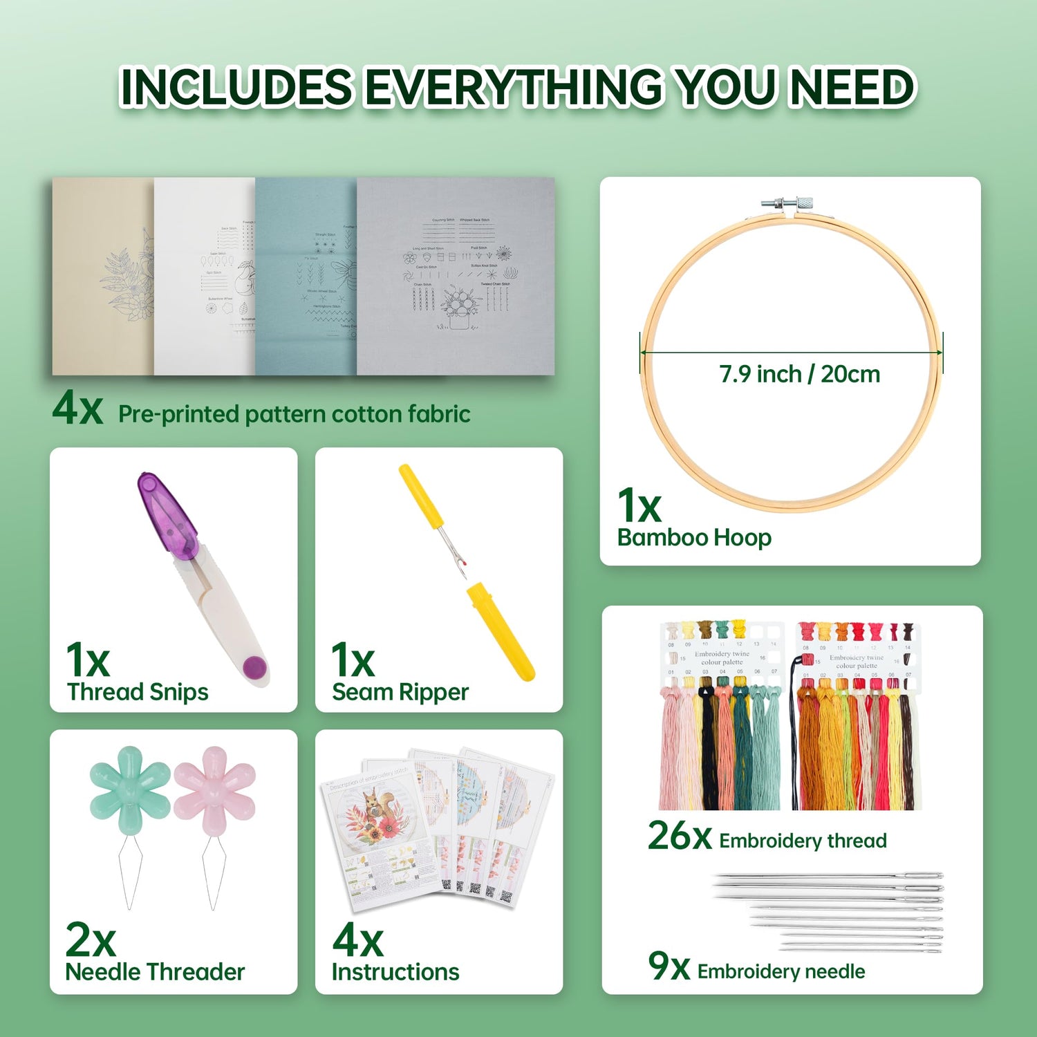 - Including Everything Need: 1 Bamboo Embroidery Hoop (7.9 in /20cm), 4 Pre-Printed Cotton Cloths, 26 Colors of Embroidery Thread, 9 Embroidery Needles, 4 English Instructions, 2 Needle Threaders, 1 Thread Snips, 1 Seam Ripper. The kit includes all the necessary materials and instructions to get started on cross-stitch and hand embroidery projects.