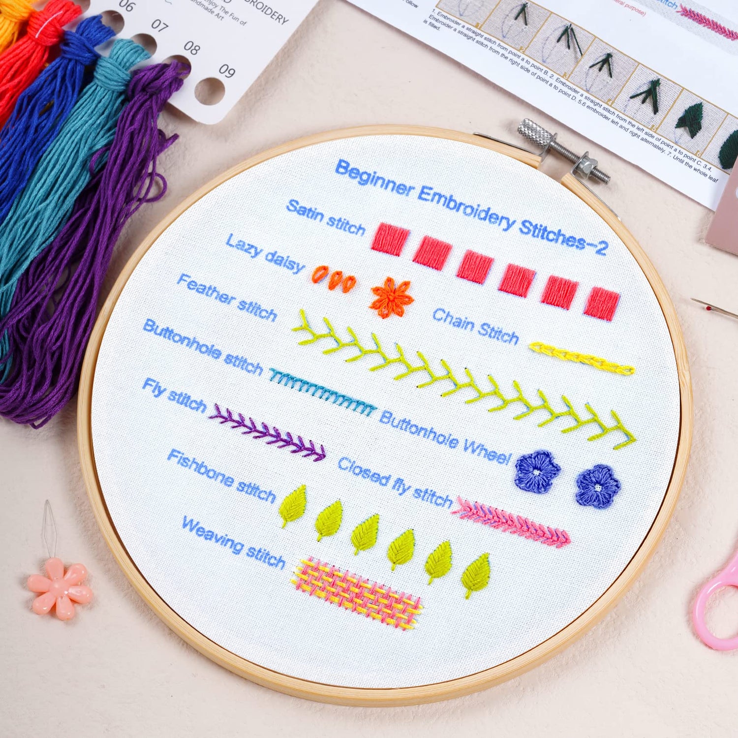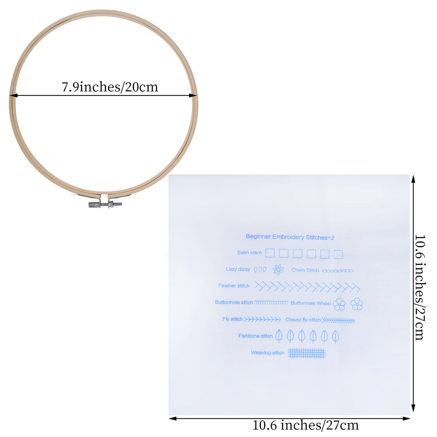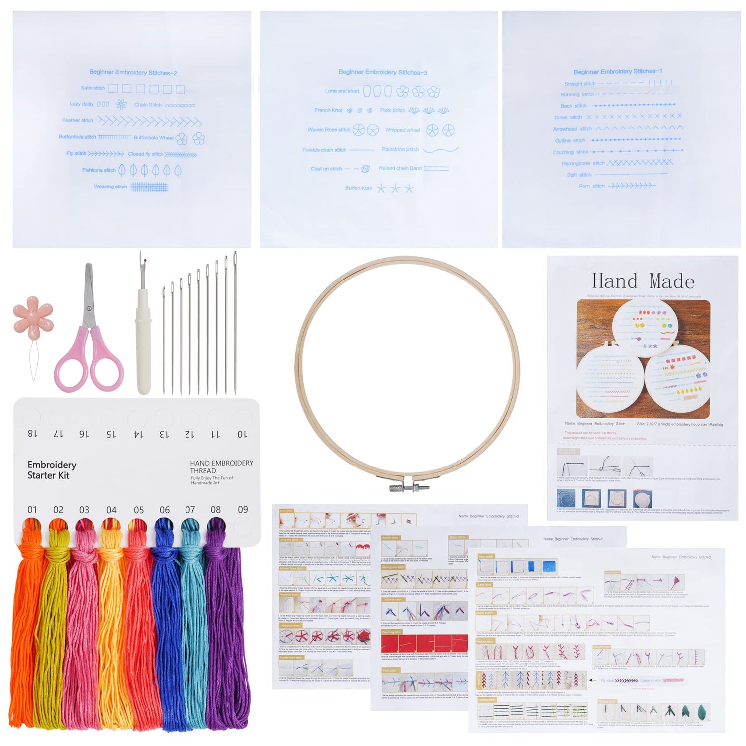 • Package Contents: 1pcs Bamboo embroidery hoop, 1 set of enough threads in 8 colores, 3pcs embroidery fabric with pattern, 9pc embroidery needles, 1 instructions. 1pcs scissor, 1pcs needle threaders, 1 Seam ripper. With complete tools and instructions, you can start to enjoy embroidery fun just with this set.