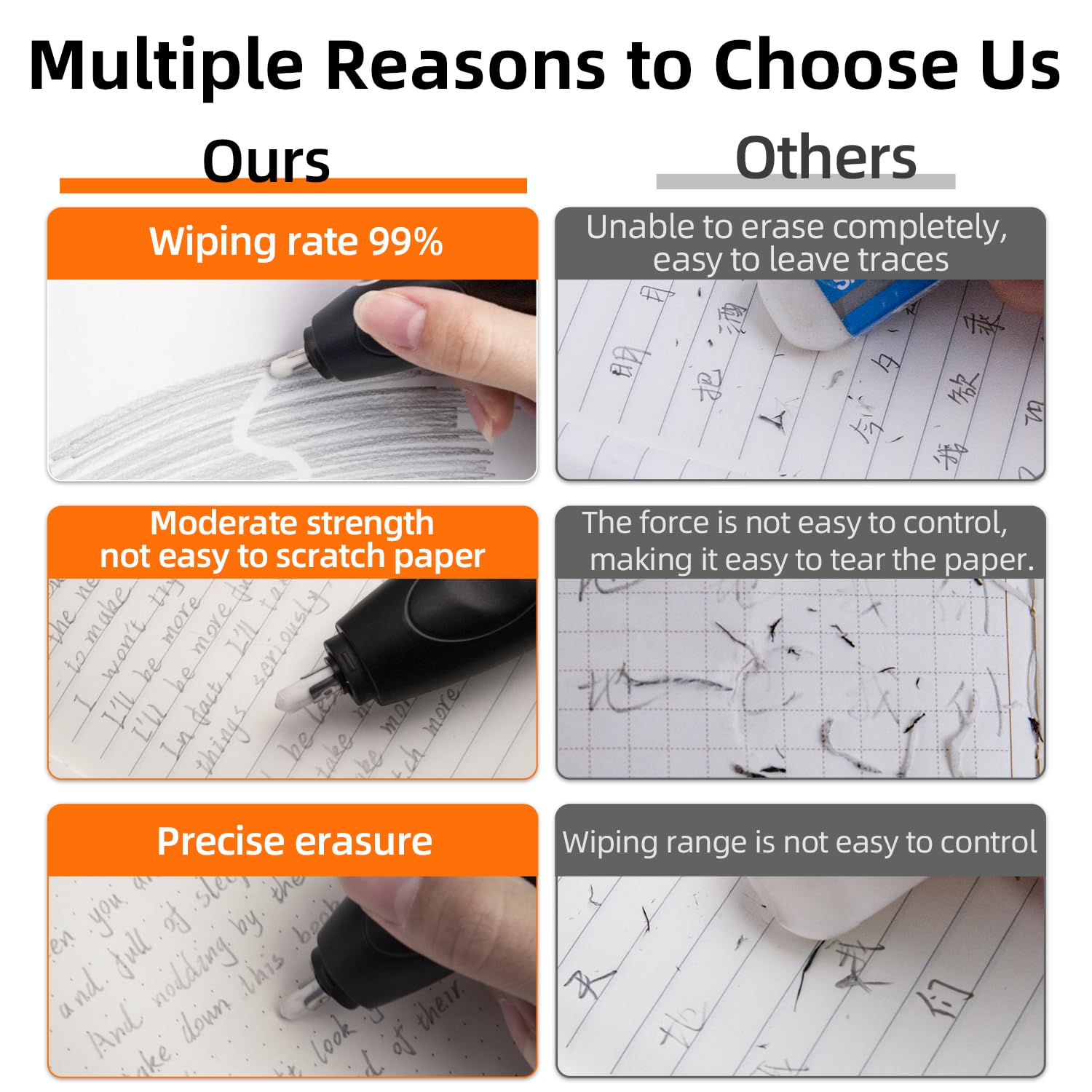 - 【Comfortable Switch Design】This automatic portable eraser has an ergonomic design for a better grip and more comfortable to hold. The large switch is very sensitive. Simply press the button to eliminate marks.