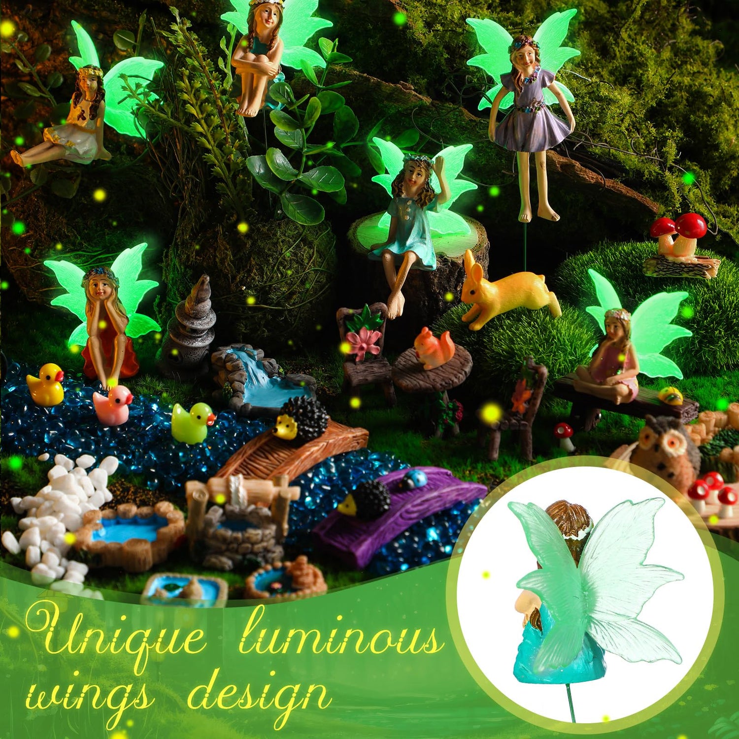• Garden Accessories Set: the package includes 50 pieces garden accessories, including 6 different styles small fairies figurines with luminous wings, red mushrooms, tables and chairs, rabbit, squirrel, owl, bench, pond, water well, bridge, pool waterfall, and more, enough quantity and good combinations to meet your decor needs and replacements