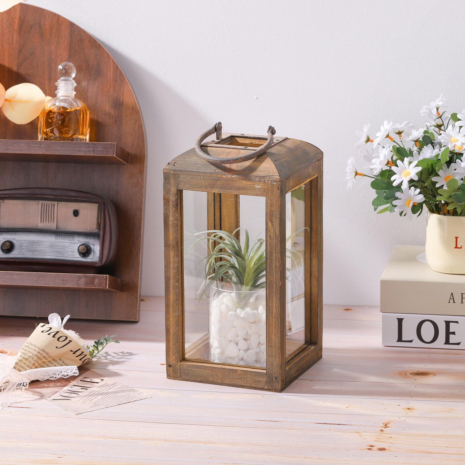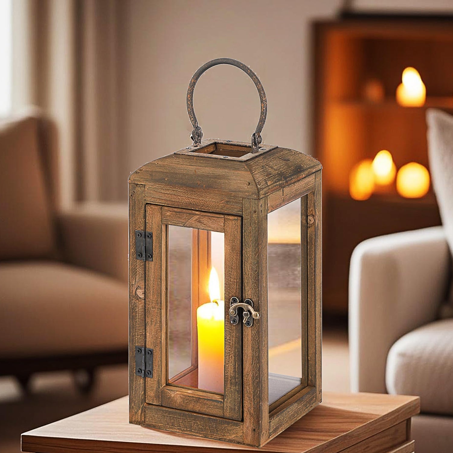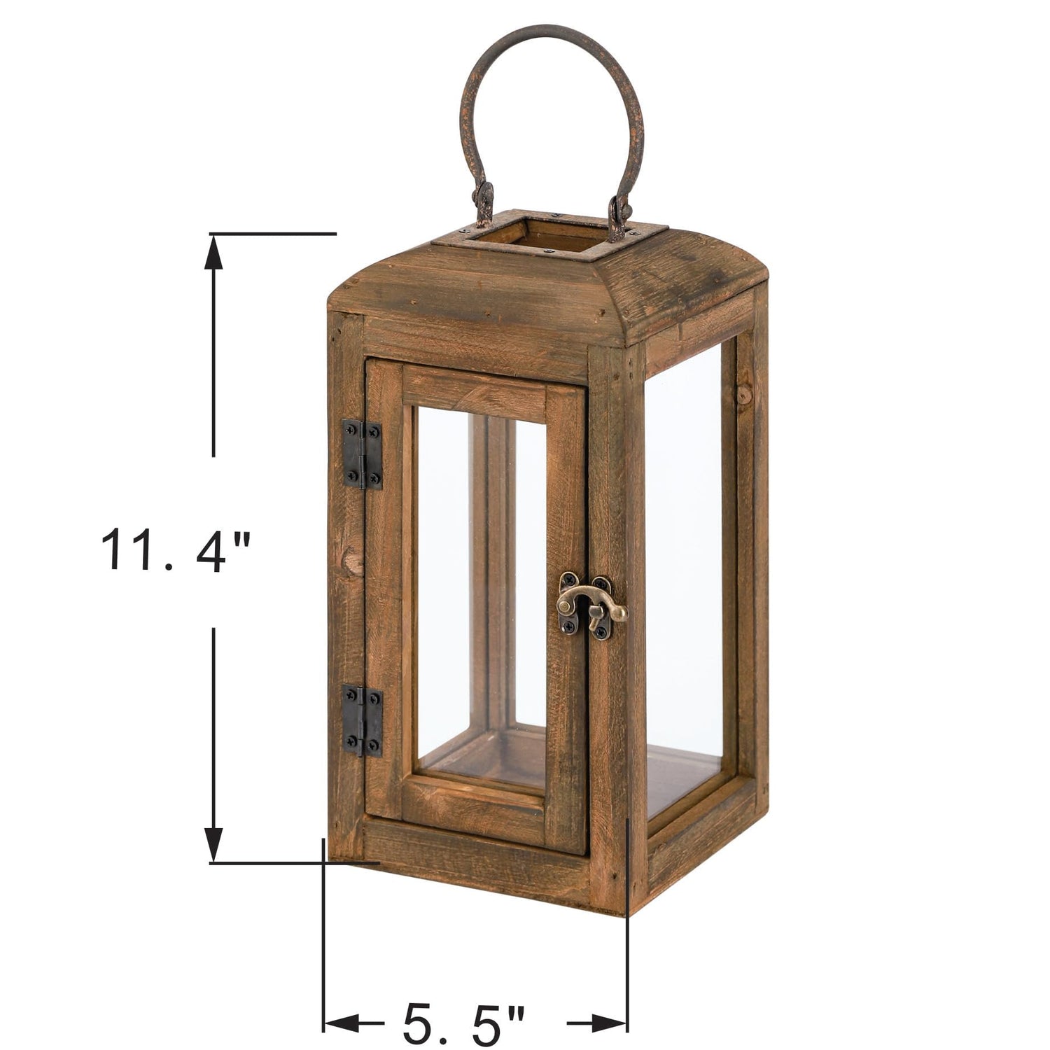 11" High Wooden Lantern Made of Solid Firwood in Handpainted Mediterranean Brown with Metal Handle,Hurricane Lantern, Farmhouse Lantern for Party, Deck, Front Porch (1, Brown, Small)