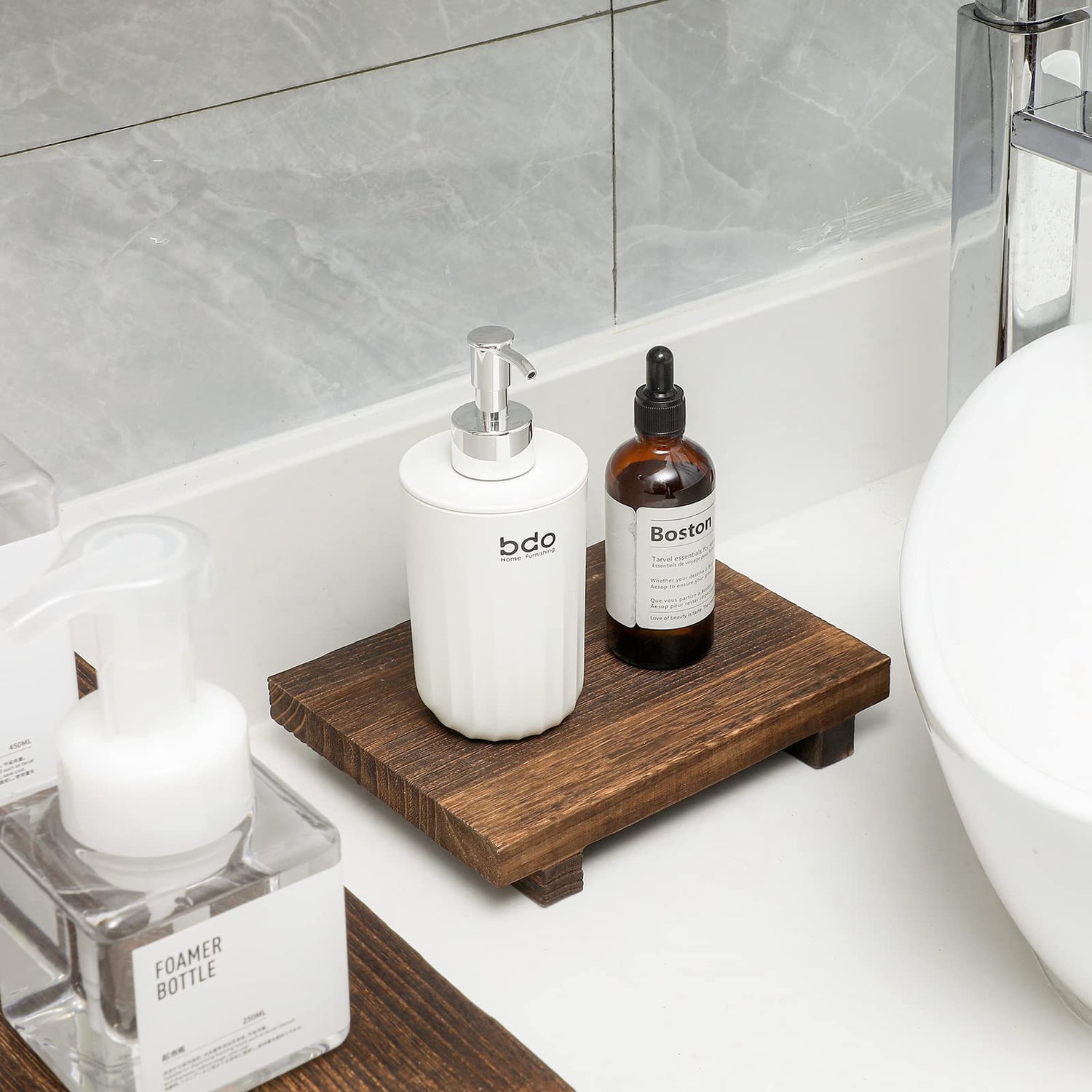 The wood riser soap tray is made of solid wood material, each wood riser is finished by sanding, polishing, and staining. It is aesthetic and strong enough with a polished surface, edges, and rounded corners.