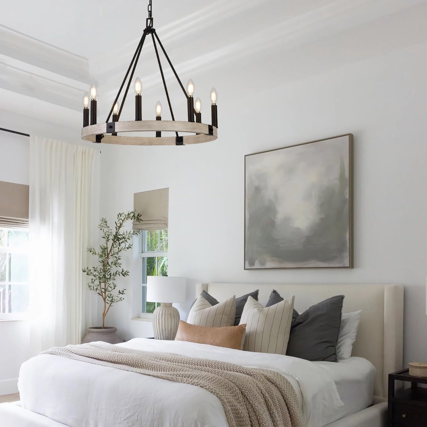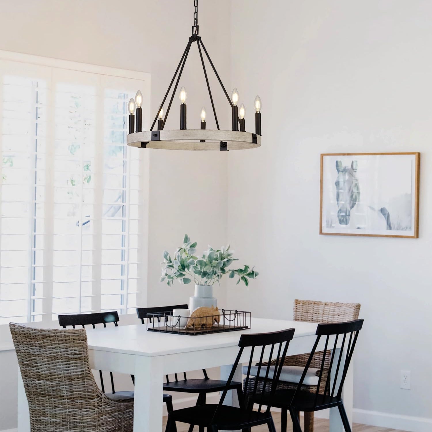 Alolvios D24'' Modern Farmhouse Chandelier, 8 Lights Wagon Wheel Chandeliers for Dining Room Kitchen Living Room Entryway, Rustic Adjustable Height Candle Chandelier Pendant, White Oak Finish