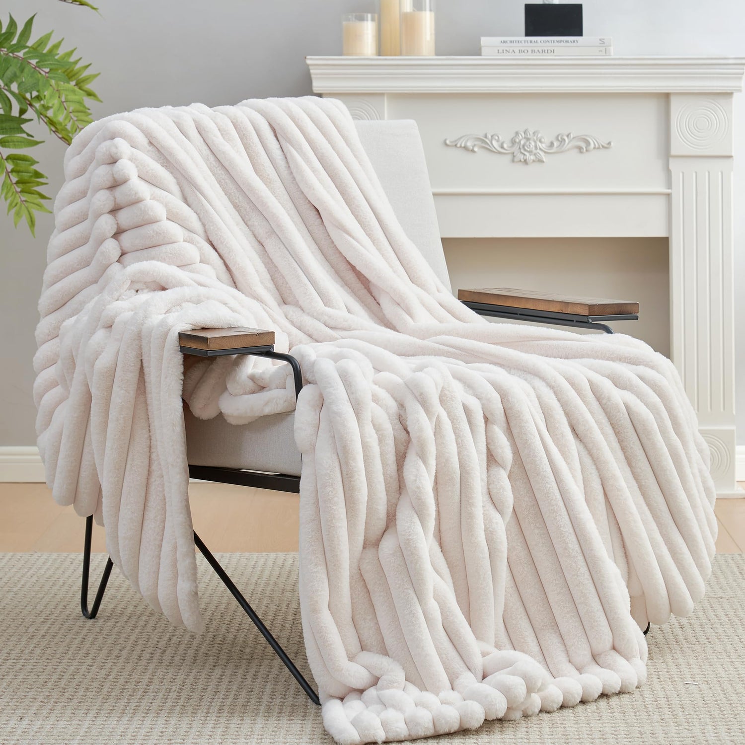 Amélie Home Faux Fur Throw Blanket for Couch, Cozy Fuzzy Fluffy Fur Luxurious Soft Striped Plush Gift Blankets for Family Sofa Chair Bedroom, 55"x70", Ivory