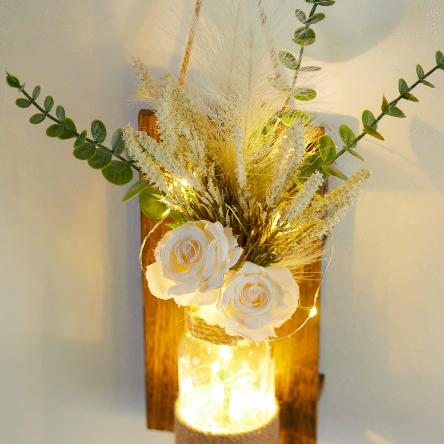 Anna's Whimsy 2PACK Mason Jar Sconce Wall Decor Rustic with Remote Control LED Fairy Lights - Artificial Flowers Spring Decorations for Home Bedroom Farmhouse(White Rose)