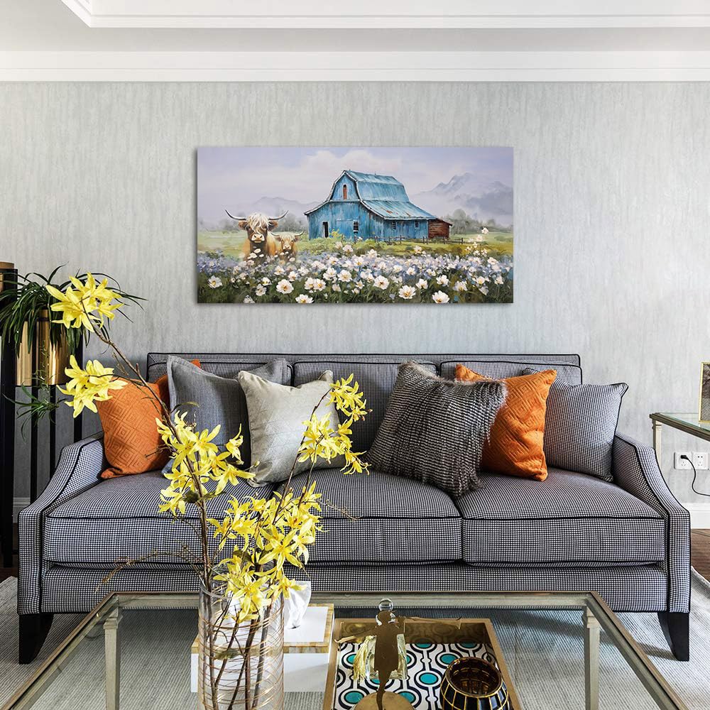 Anolyfi Blue Barn Picture Farmhouse Canvas Wall Art Highland Cow and White Flowers Landscape Textured Painting Large Scenery Artwork Framed for Living Room Bedroom Bathroom Office Home Decor 40"x20"