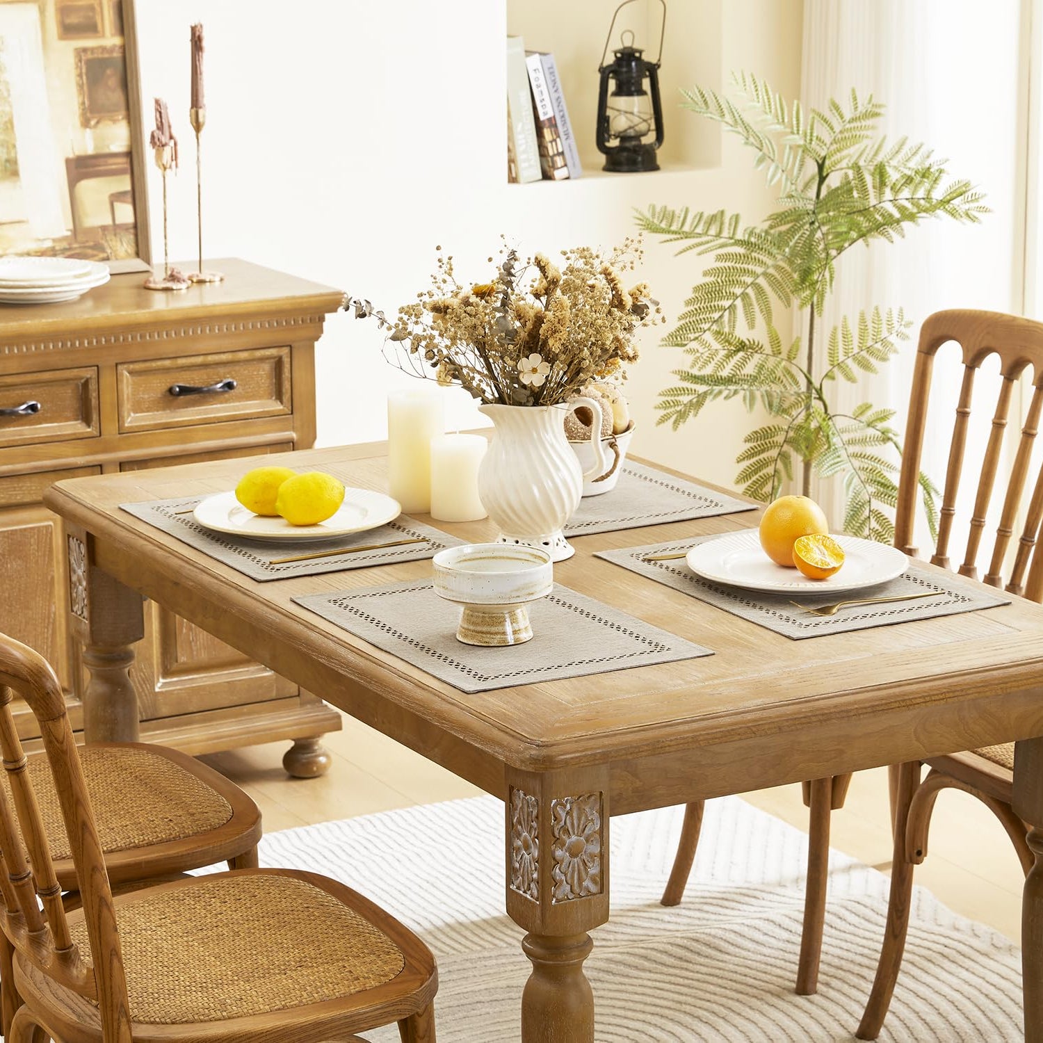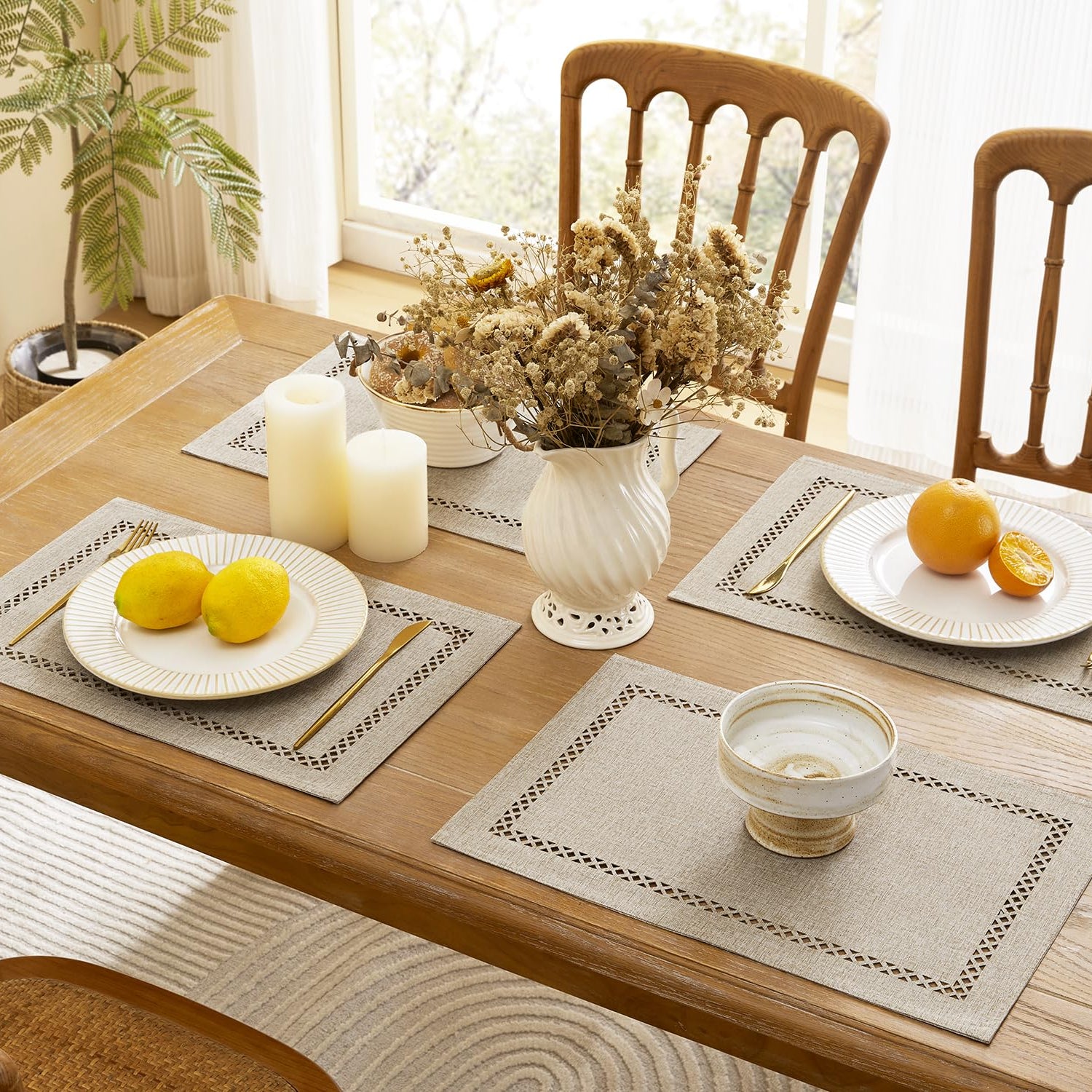 - Recommend Highly: The natural color of our placemats fit with most table colors. When decorating your table, still coordinating with your rug and other room decor. These placemats would make an amazing gift for New Year's Day, Christmas Day, Valentine's Day, Easter Sunday, All Saints' Day, Thanksgiving Day and so on.