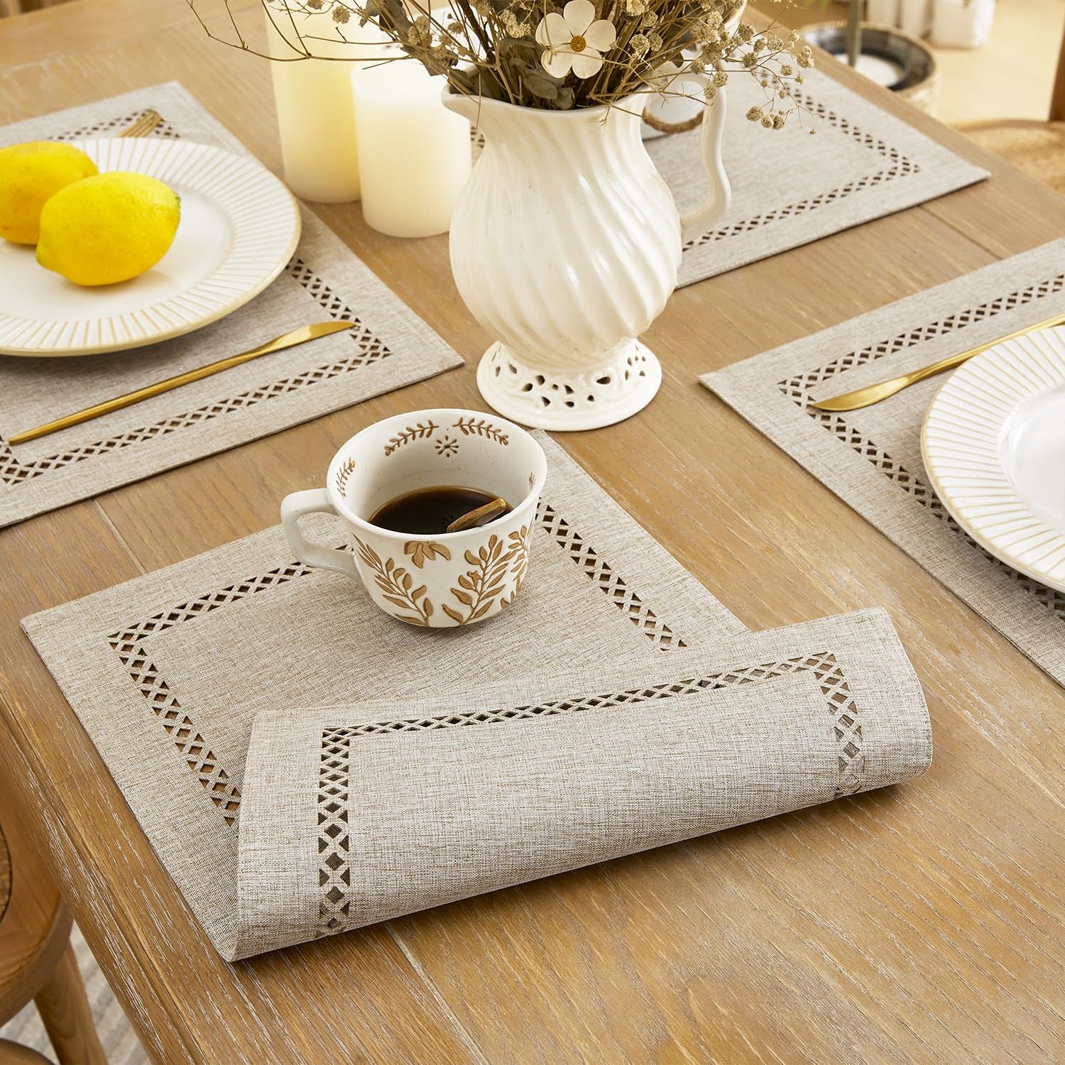 Aoztio Burlap Placemats Set of 4, 12 x 18 Inch Rustic Geometric Hollow Place Mats, Heat Resistant Placemats for Farmhouse Kitchen Table Decor, Coffee 4PCS
