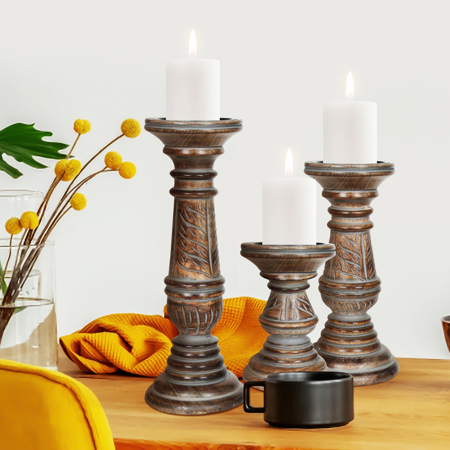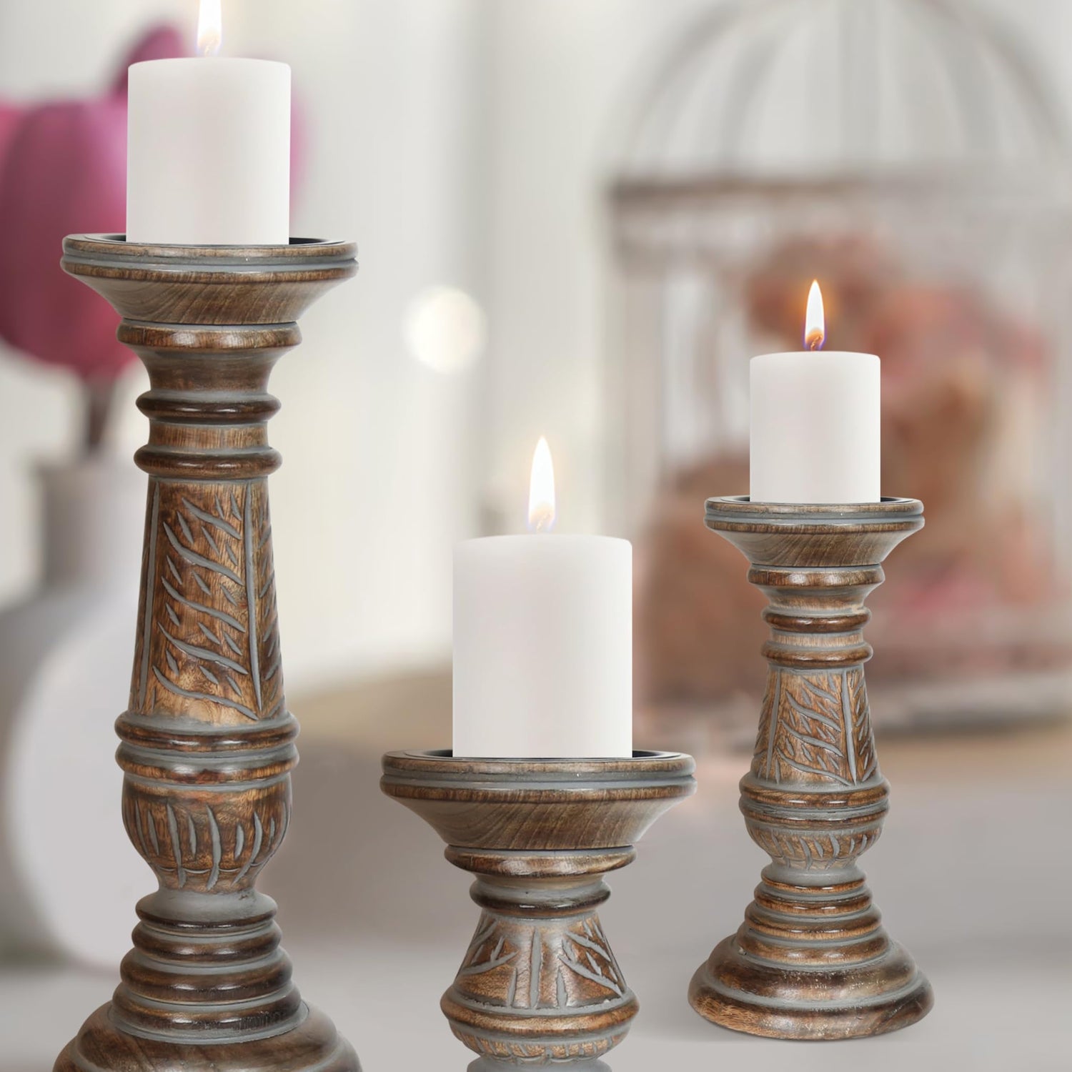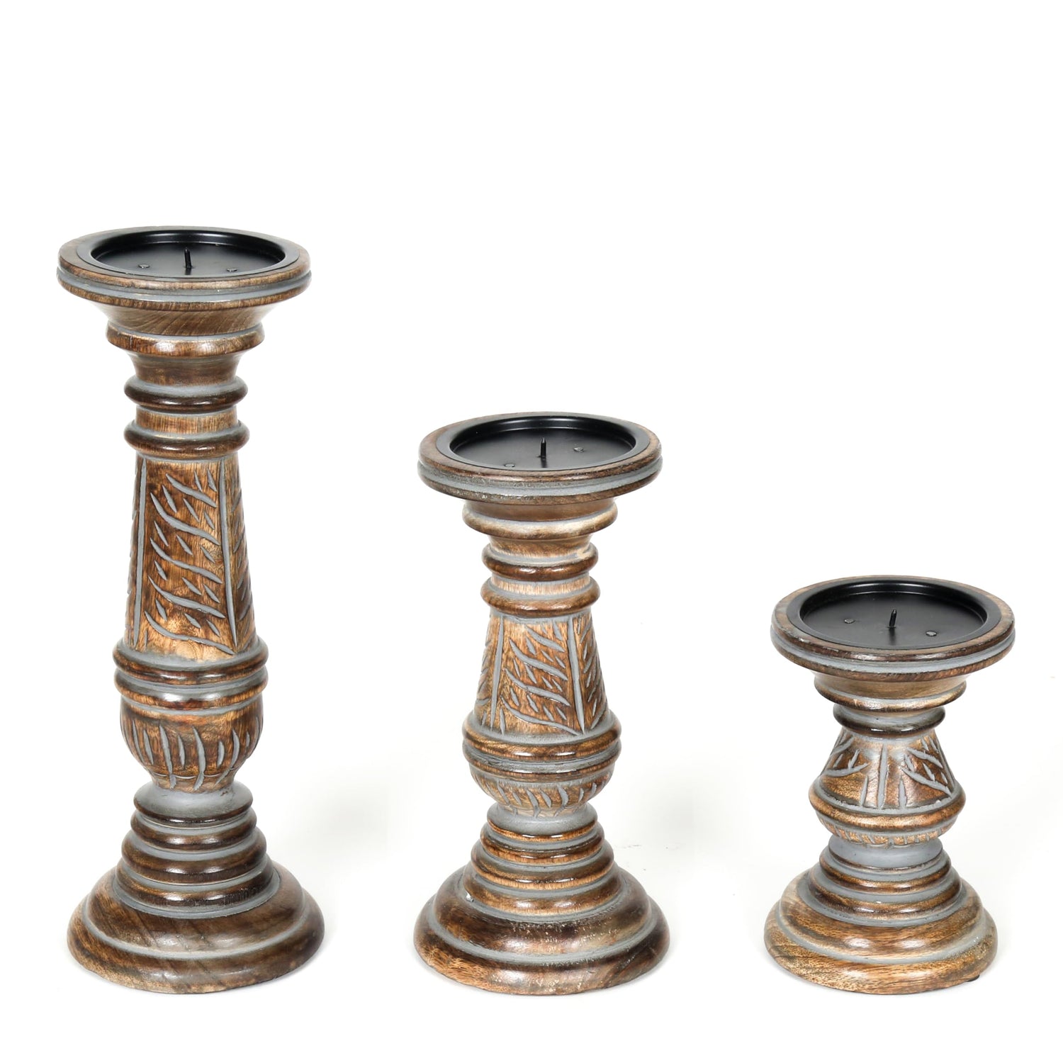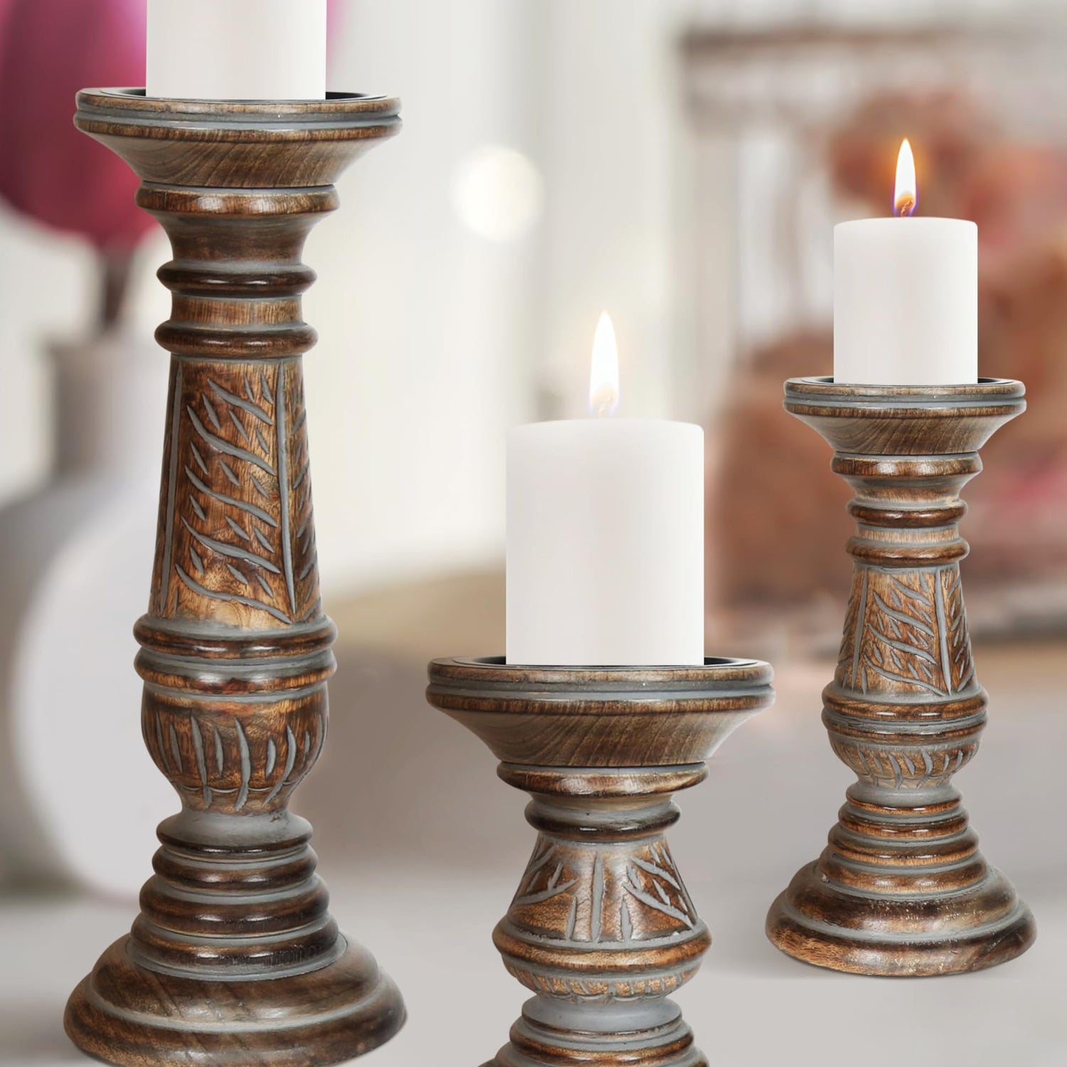 Candle Holders for Pillar Candles (Grey Wash, Set of 3) - Mangowood Candle Stand - Farmhouse Wooden Candle Holders Pillar Leaf Design - Candle Holder Decor for Table Centerpiece - 6”, 9”, 12”
