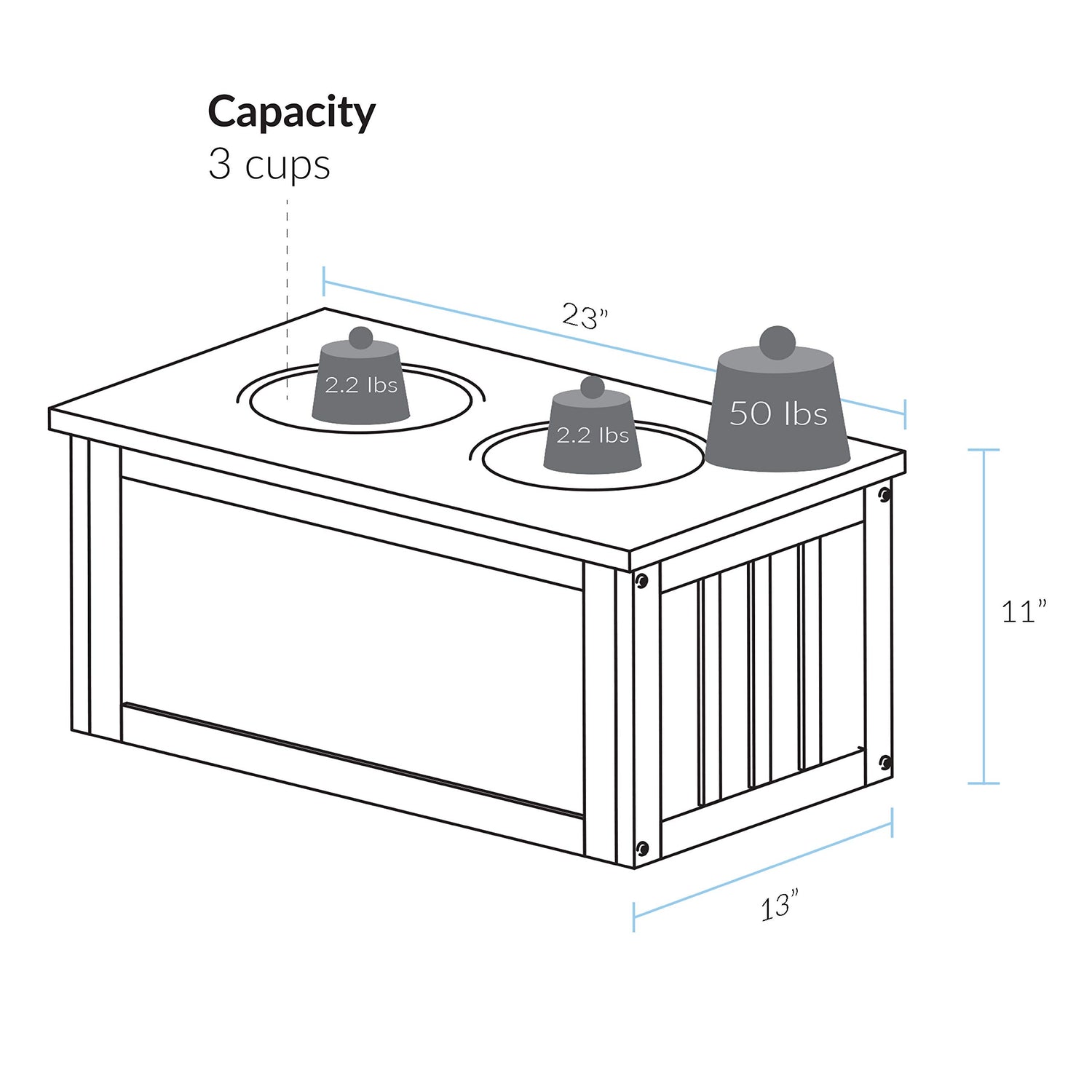 Details: Inspired by the classic two tone theme of farmhouse style furniture, our Pet Feeder Storage Stand is a simple but pleasant addition for both your pet and home. The top piece is stained in our pet safe warm brown finish and fit with 2 removable aluminum bowls for food or water. Flip up the top to find plenty of convenient storage space for sealed pet food and supplies. Standing at 11 inches tall, this stand is best suited for medium to large sized dogs. Perfect for pet owners who love keeping things neat and organized while still maintaining a well furnished home.