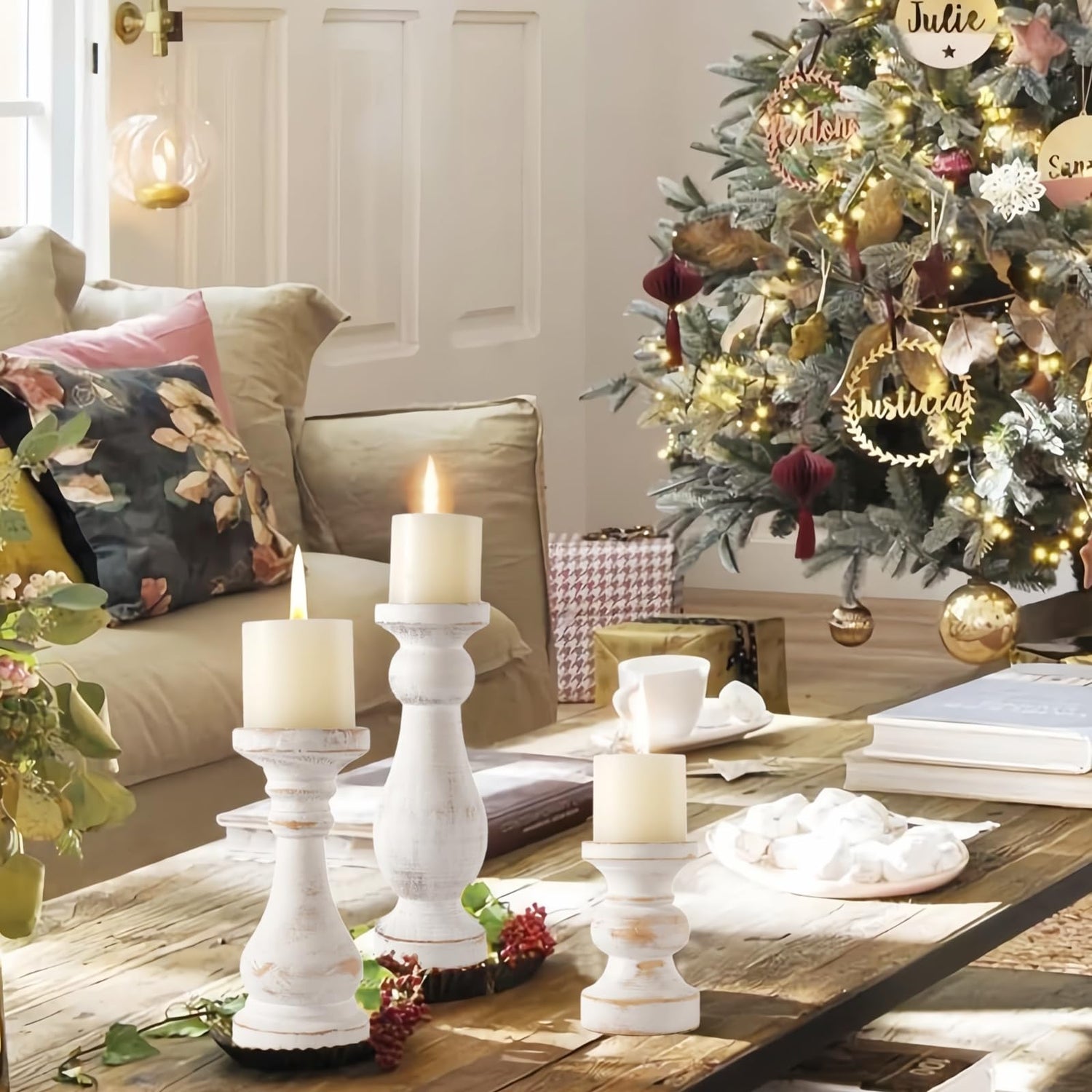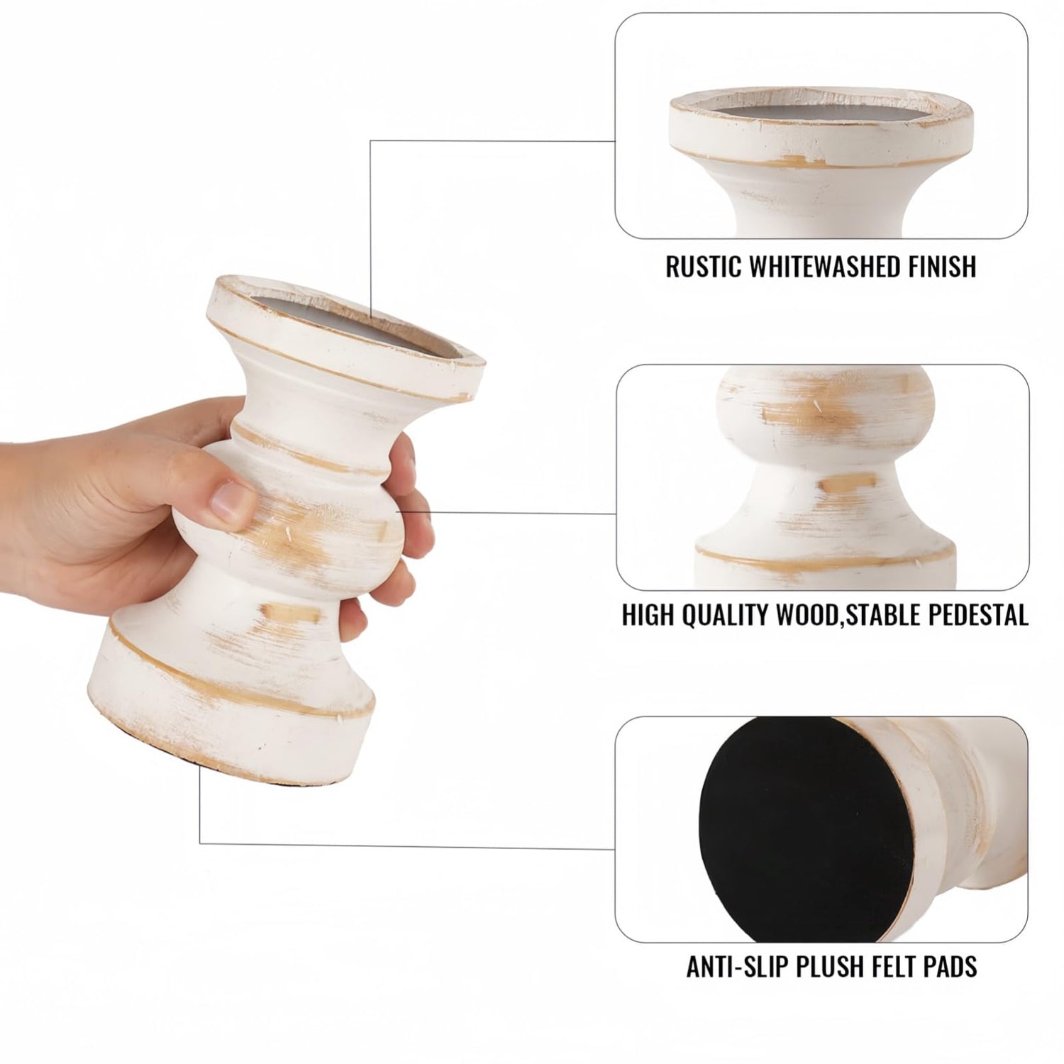 - [MODERN FARMHOUSE STYLE]: Rustic wooden candle holders pillar feature an elegant curved design with a lightly distressed white finish, adding a vintage rustic touch to the farmhouse candlestick holders, perfect for special occasions, modern farmhouse homes, weddings and parties The perfect decoration or a thoughtful gift for birthdays, housewarmings or Christmas.