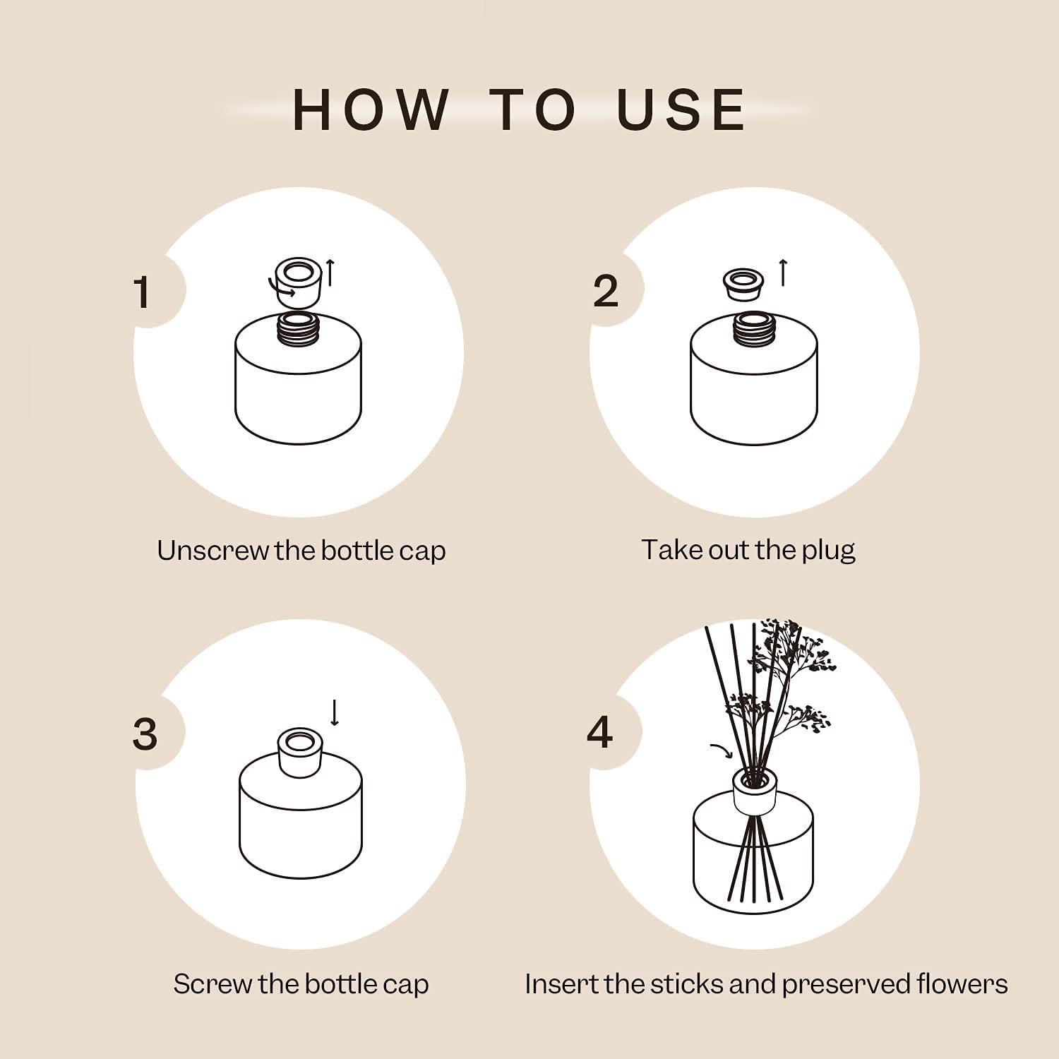 - Includes: One fragrance diffuser glass bottle, 6.7 fl oz mixture of essential oils combined with fragrance, one pc. of real preserved baby's breath flowers, and 8 pure cotton sticks. Adjust the amount of aroma released by adding or removing the sticks.