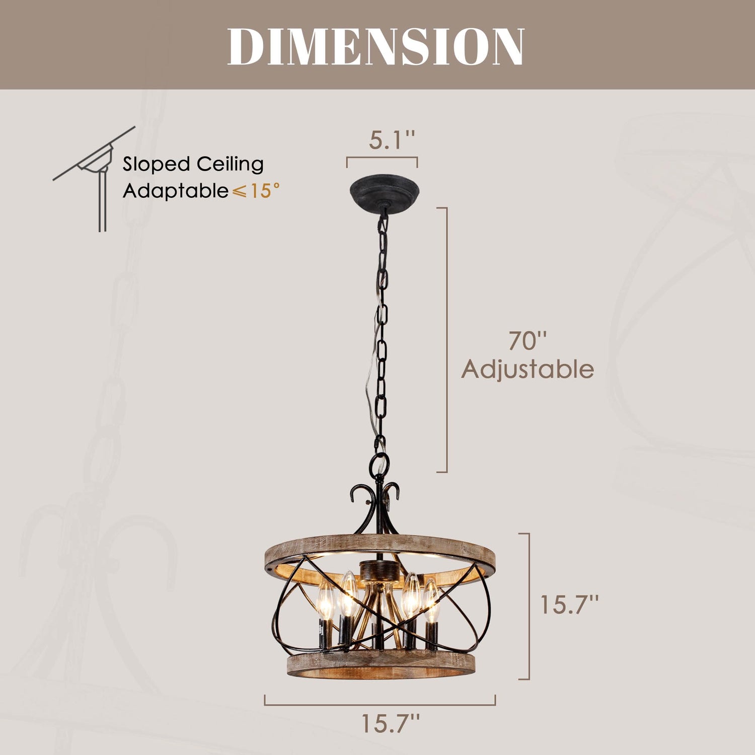 • [Easy to Install] All hardware required are included in the package. The rustic chandelier size is 15.7" in diameter x 15.7" in height. Adjustable chain(max: 70"). It can be installed on flat, sloped ceiling(max 15 degree). Simple Steps: Assemble this dining room chandelier; adjust the desired chain height and wiring; screw in bulbs.