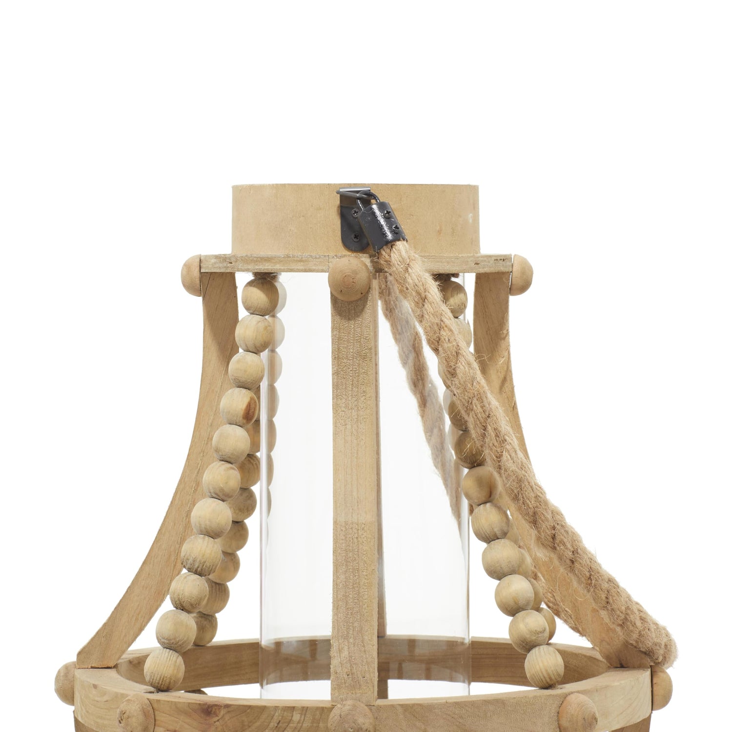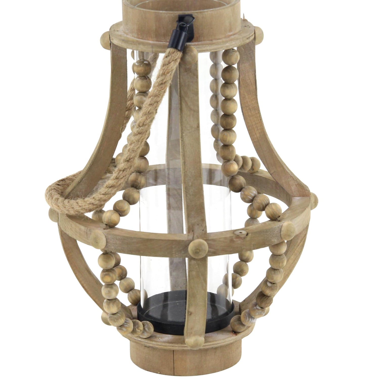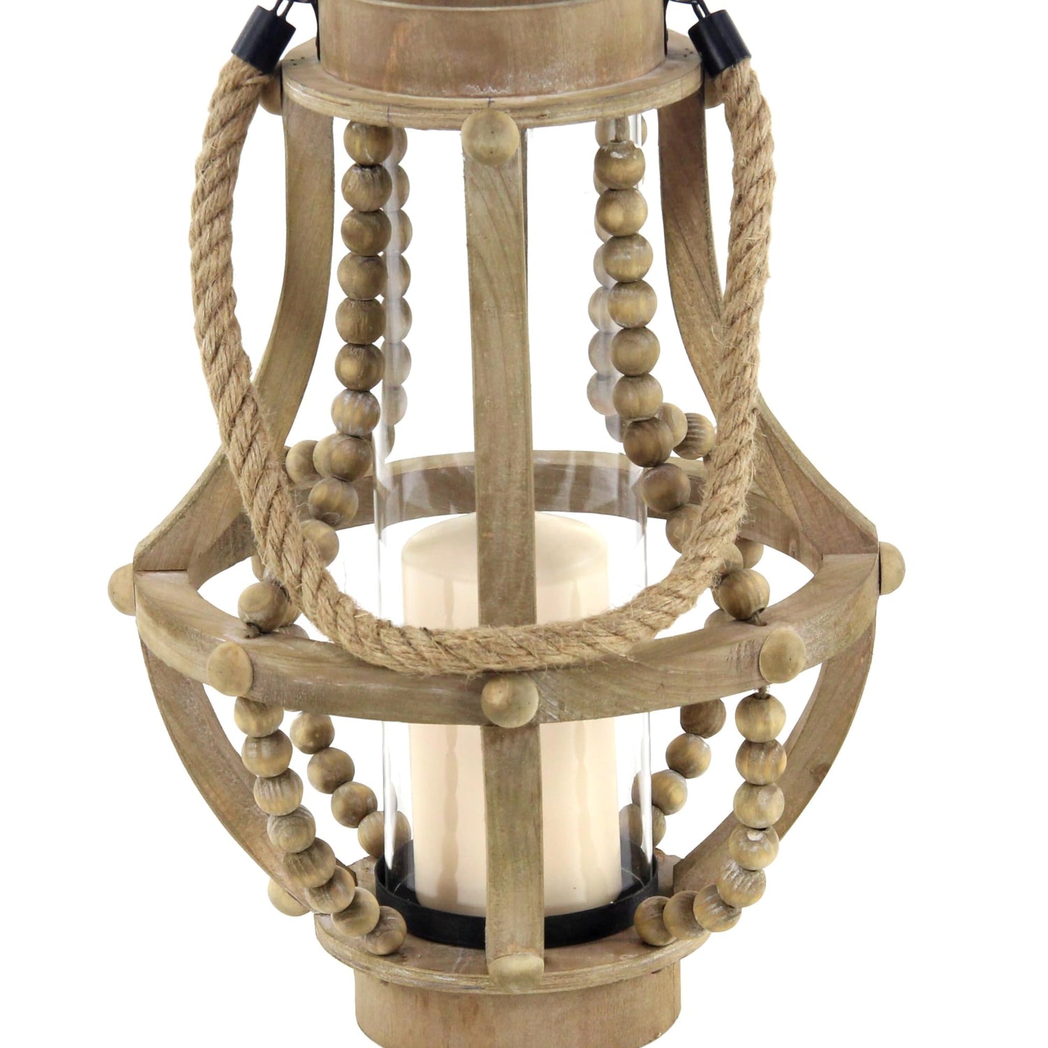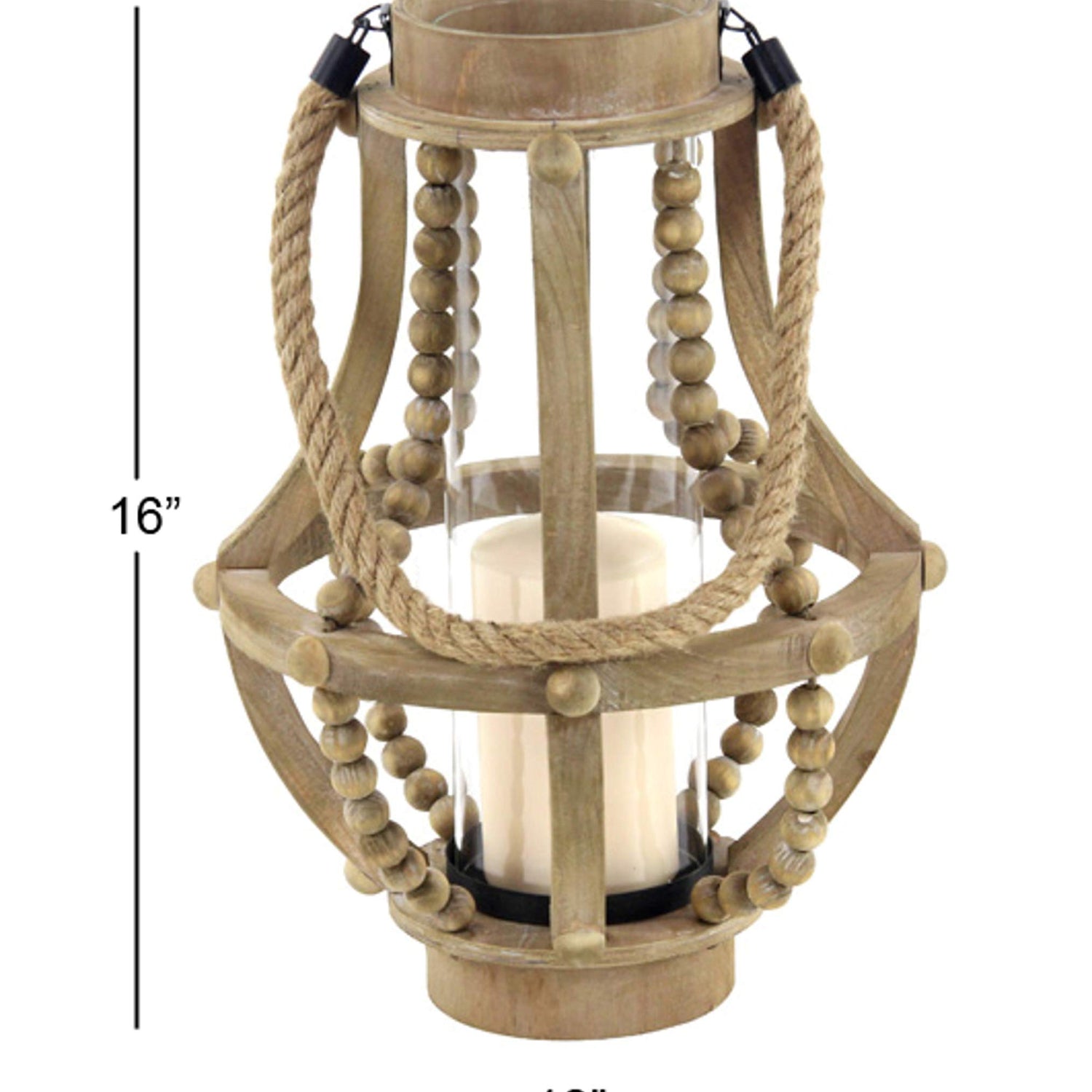 Details: Wood is intricately carved and given a natural distressed finish to form a versatile farmhouse candle holder design. This decorative candle holder features a pear-shaped body with a beaded cage design, an inner glass candle holder base, and a jute rope accent handle. Wipe clean with a dry cloth. Delight your guests and make any occasion extra special by adding a lighted or flameless candle to this lantern. Made with a sturdy base, it is perfect for creating an elegant atmosphere at your table top or mantel. This nifty wood candle holder is a great decorative piece for entryways, side tables, console tables, hallways, and bedrooms. Designed with felt or rubber stoppers at the base that prevent scratching furniture and table tops, as well as sliding around. Can hold 1 pillar candle, not included. This item ships in 1 carton. Please note that this item is for decorative use only. Comes with round mouth and base, wooden beads, and rope handle.. Suitable for indoor use only. This item ships fully assembled in one piece. This is a single beige colored lantern candle holder. Farmhouse style.