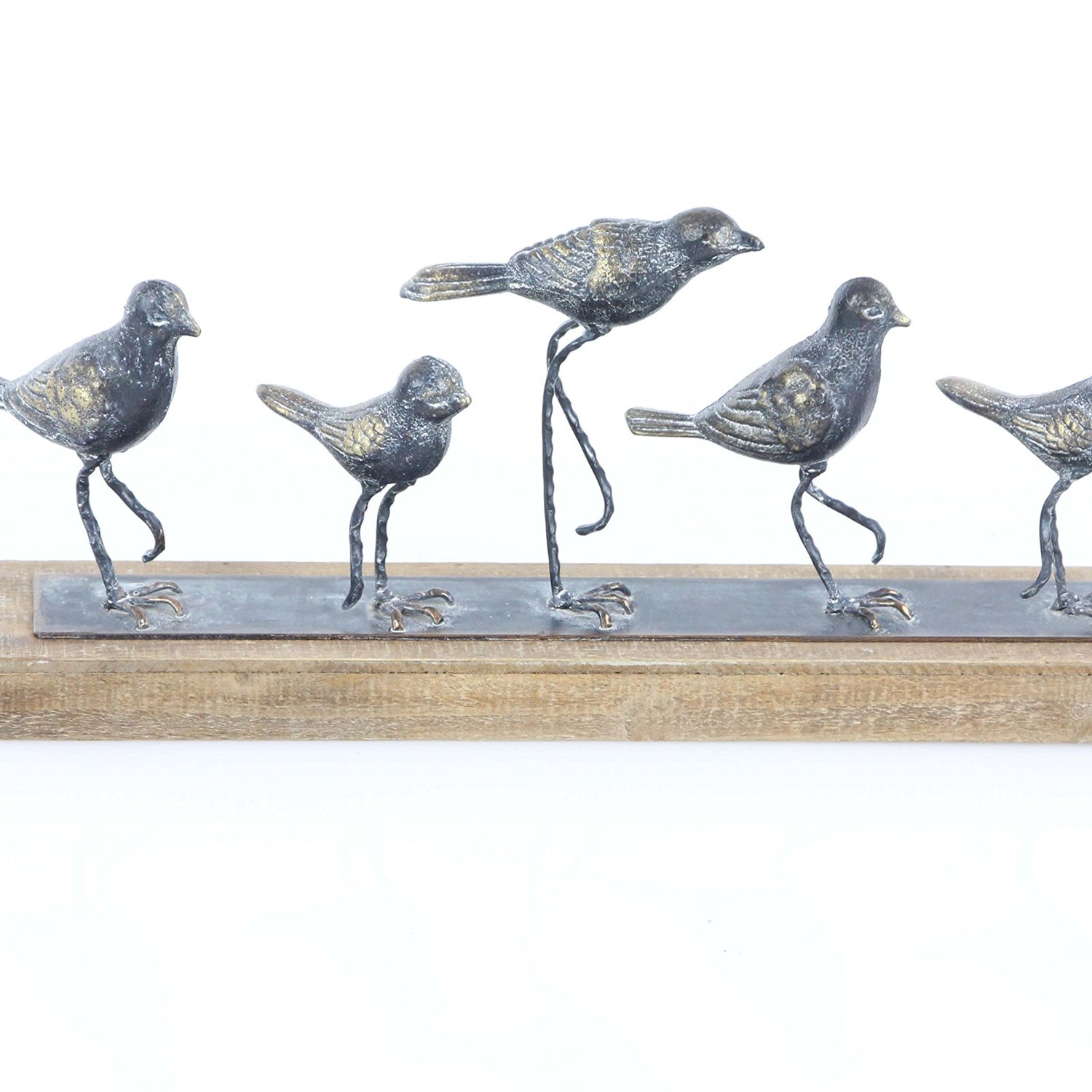 - GRAY AND BROWN HOME DECOR FIGURINE: Textural metallic silver bird figurines, textural finish with detailed carvings and gold brushing and natural beige wood base