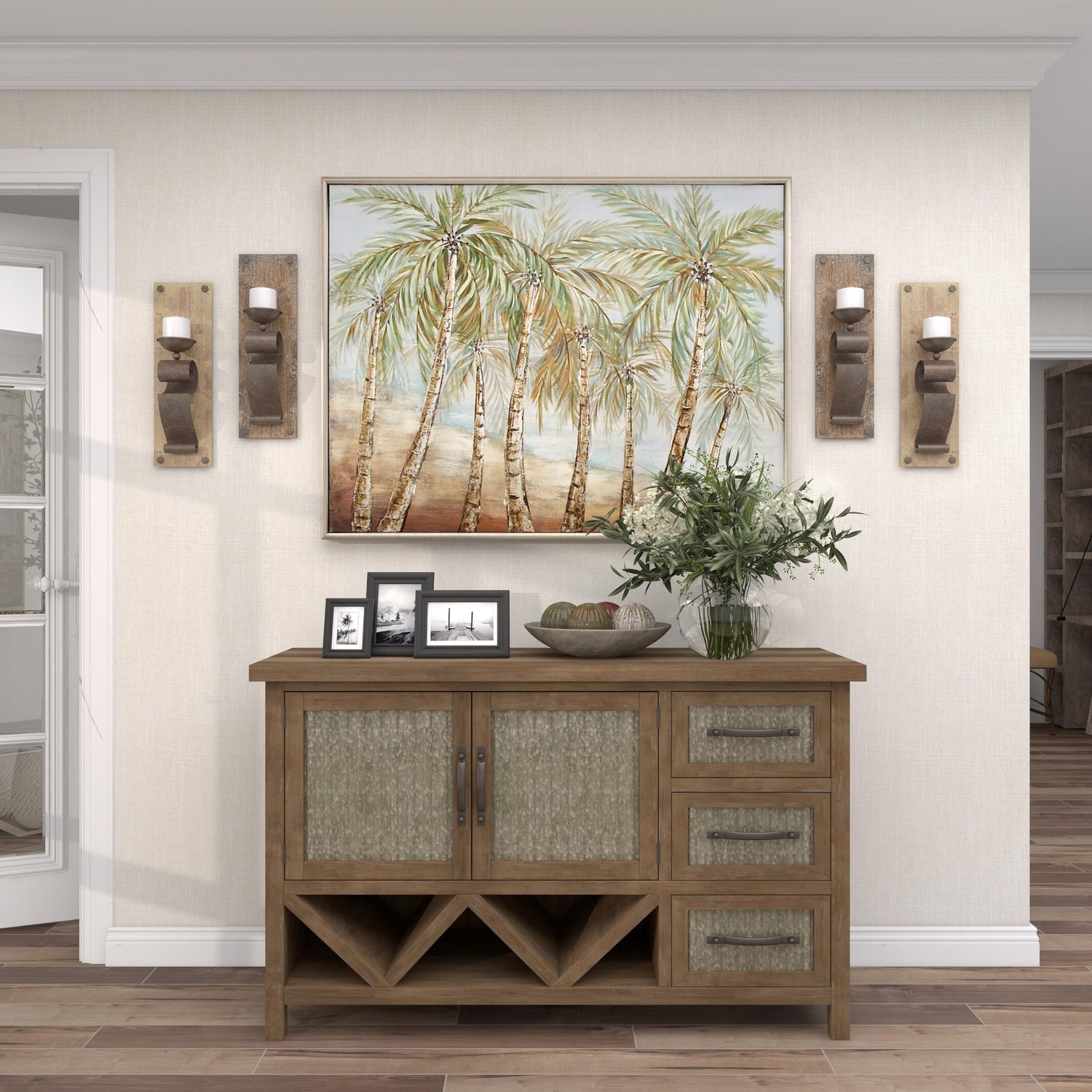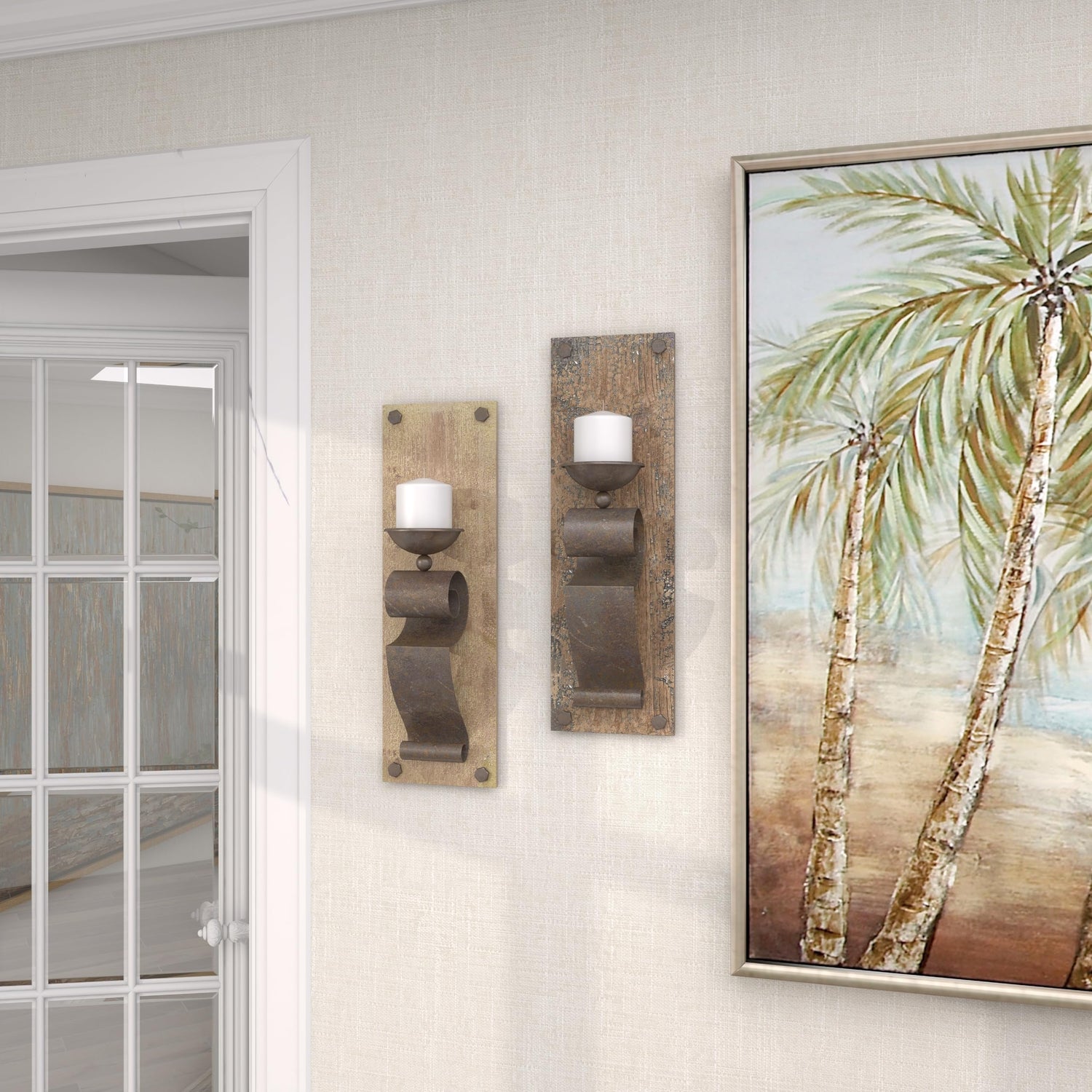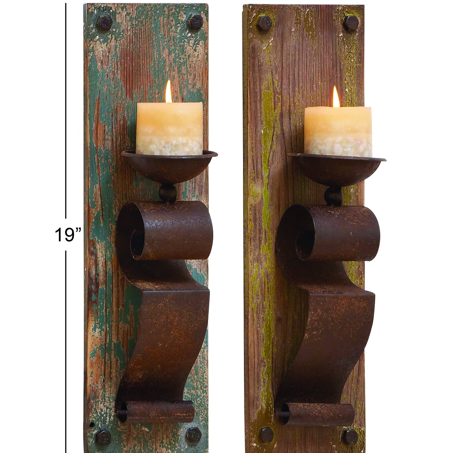 Details: Set of two 19 inch rustic rust brown finish iron, polystone and distressed wood rectangular wall mounted sconces, each with curled metal supported pillar candle cup.