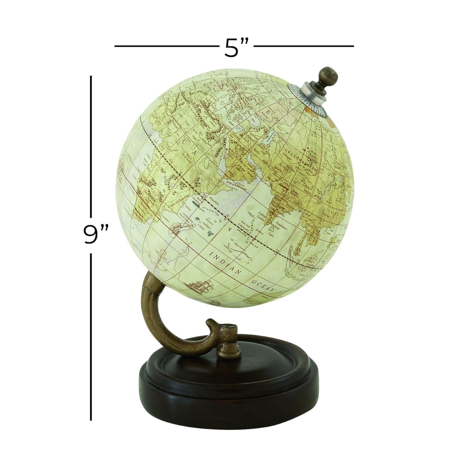 Details: Place this globe on any counter or table to show your love for traveling. Embark on an exciting adventure with this world globe decor. Adds vintage flair to an office desk or study table. Designed with felt or rubber stoppers at the base that prevent scratching furniture and table tops, as well as sliding around. This item ships in 1 carton. Features a globe with detailed continent illustrations and typographies. Wood globe makes a great gift for any occasion. Table top globe measures 5in diameter. Suitable for indoor use only. Made in India. This is a single globe. Traditional style.