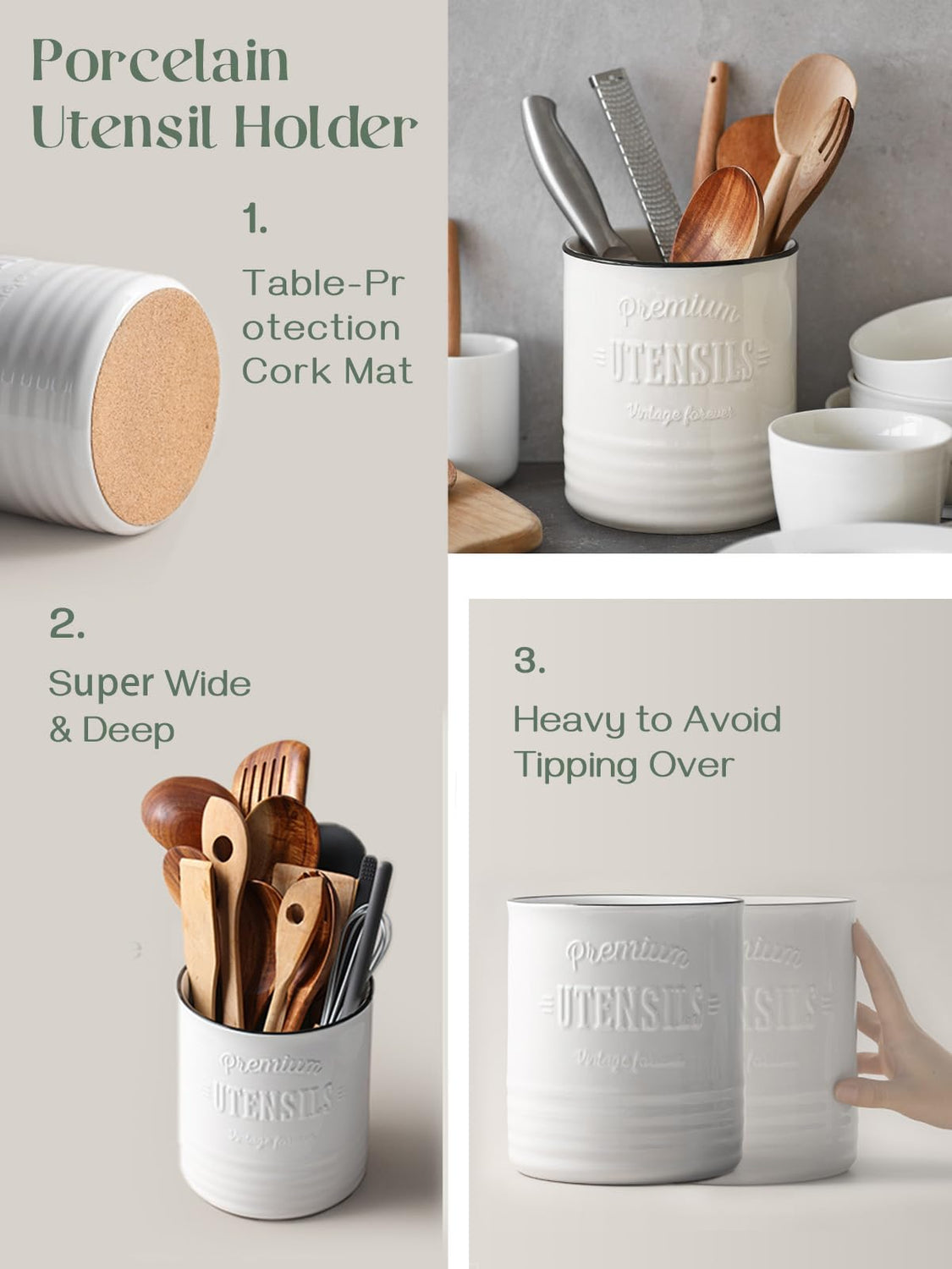 DOWAN 7.2″ Extra Large Kitchen Utensil Holder - Farmhouse Utensil Holder for Countertop - Ceramic Utensil Crock with Protection Cork Mat - Kitchen Decor & Housewarming Gift (White)