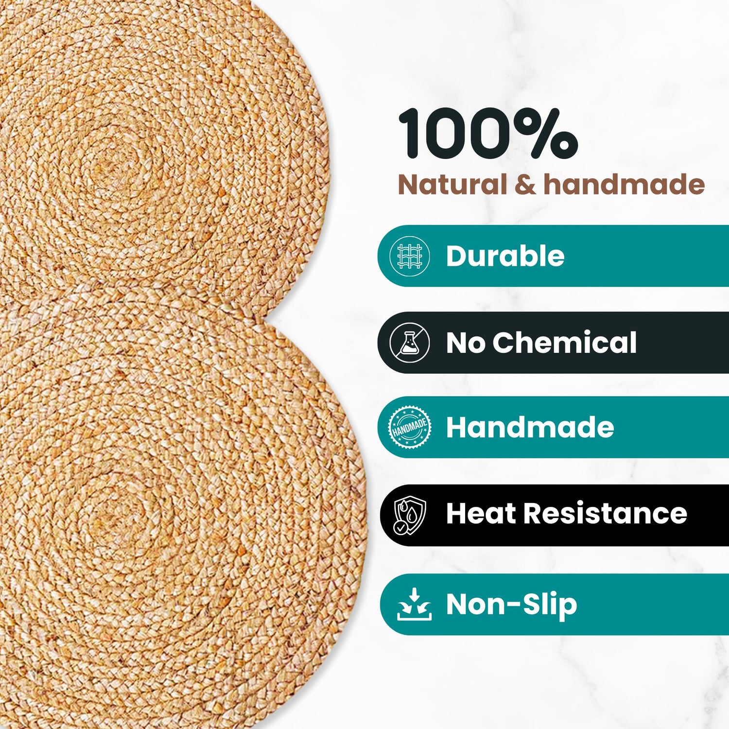 • HANDWOVEN CRAFTSMANSHIP YOU CAN FEEL: – Each placemat in this set reflects high artisan quality, woven with care to ensure durability and consistency. Unlike machine-made alternatives, these jute placemats are unique, strong, and rich in texture, making them premium additions to any kitchen placemats collection.