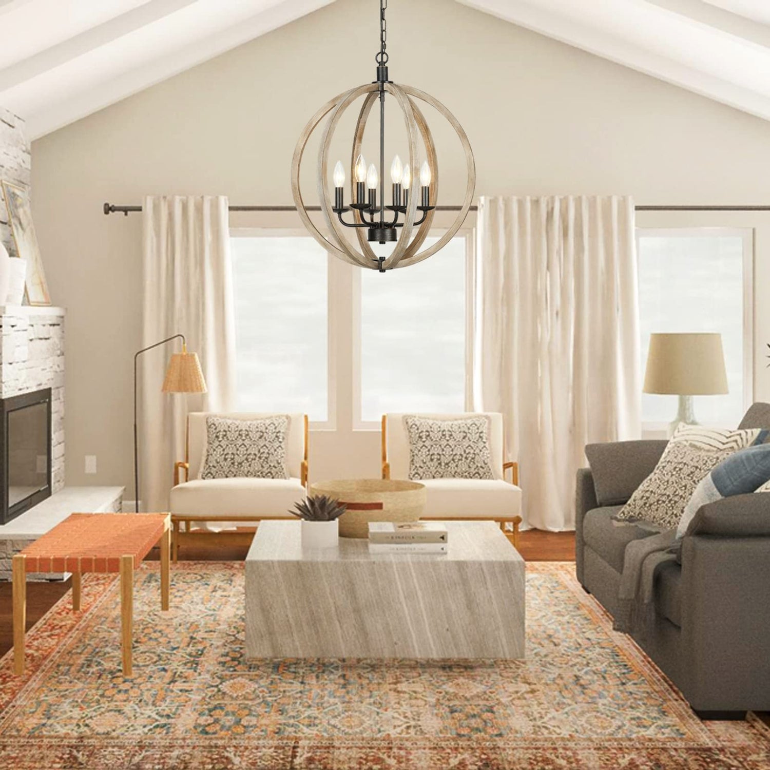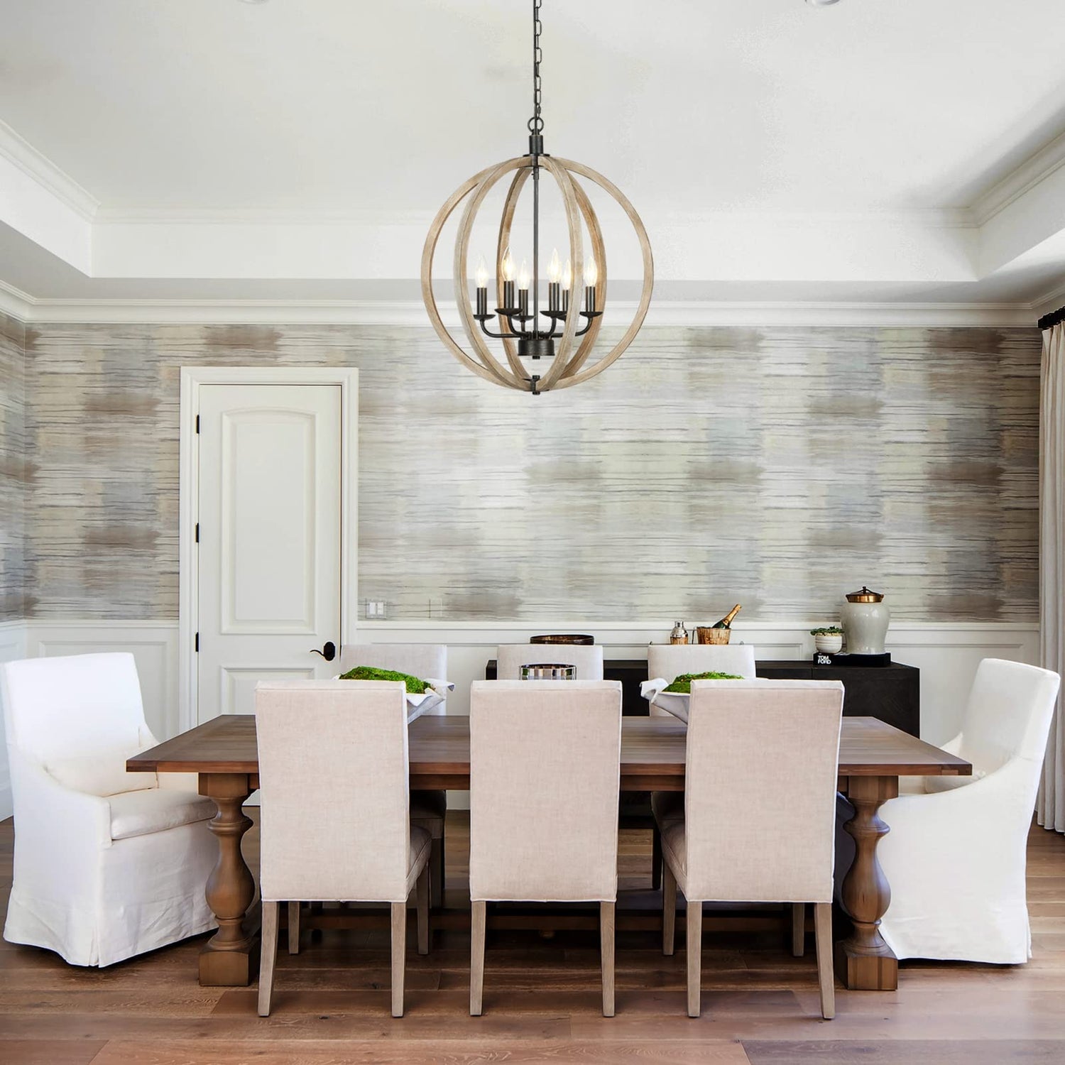 - Farmhouse Light Fixtures: This 6 light pendant light fixtures in two-tone natural wood finish features unique style and chandelier suspended in a metalwork sphere. Boasting a circular ceiling cup, chain suspension and open globe made from six curved wood bands finished in natural wood.It's a great option to make an impression in a foyer, entry hall, dining & living rooms, bedrooms as well as kitchen.