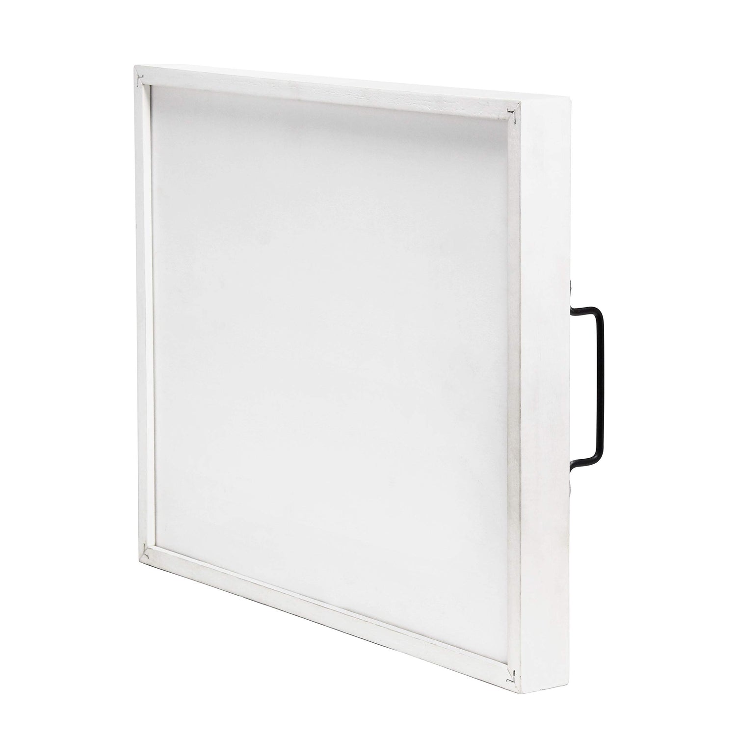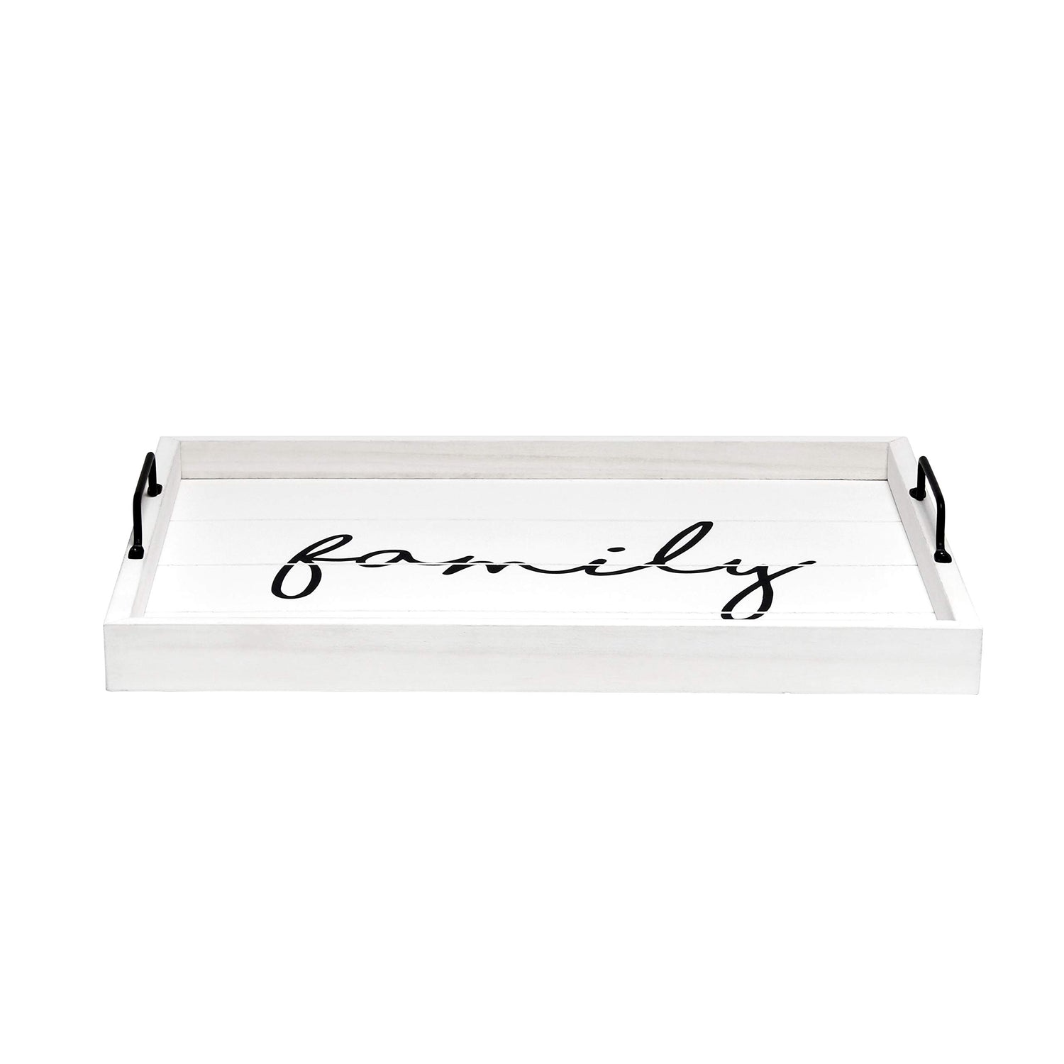 Details: Freshen up your home with this white wash wooden tray! Accented with black metal handles and black text this tray is on trend to give your home that cozy farmhouse feel. Use to serve breakfast in bed, food and drinks at a party or makes for an excellant centerpiece for your dining table, kitchen counter, coffee table or ottoman.