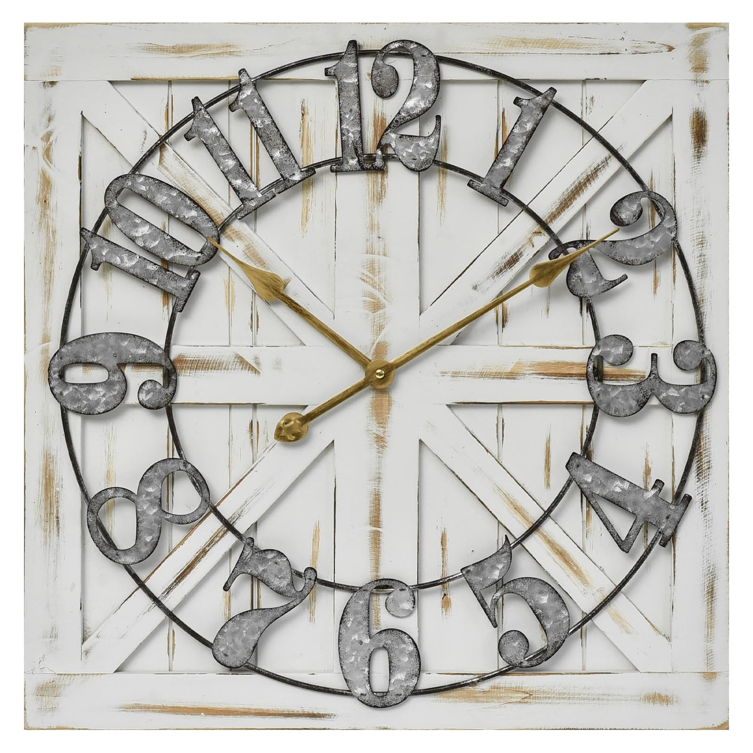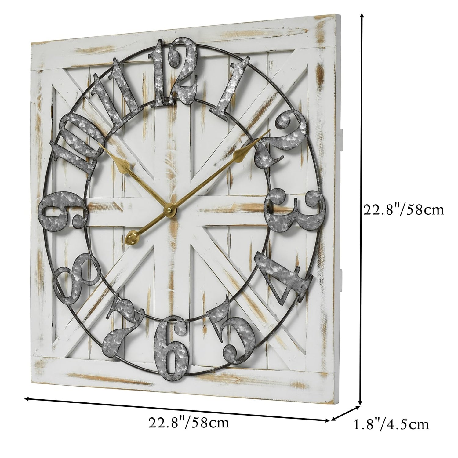 - This 24-inch square farmhouse wall clock is meticulously crafted from thick engineered wood with vintage washed white Featuring timeless farmhouse style details, including distressed wooden panels that resemble a barn door Classic Arabic numerals in Galvanized sheet finish Vintage antique gold clock needlesadd an elegant touch, tastefully enhancing any room's ambiance.