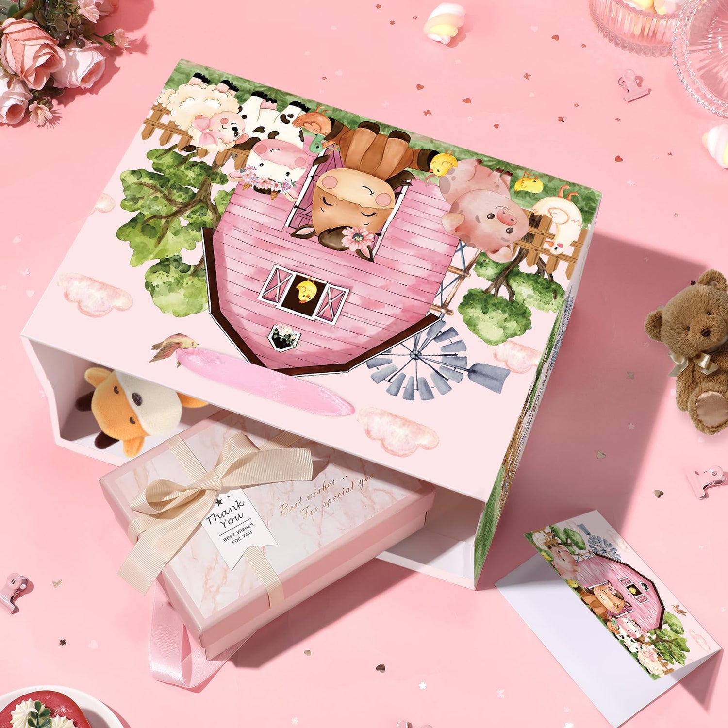 Farm Animals Theme Birthday Gift Bag for Girls Baby Shower Pink Farmhouse Barnyard Gift Bag Wrapping Paper Card Large Cows Pigs Gifts Bag for Baby Shower Farm Birthday Party Favors Supplies
