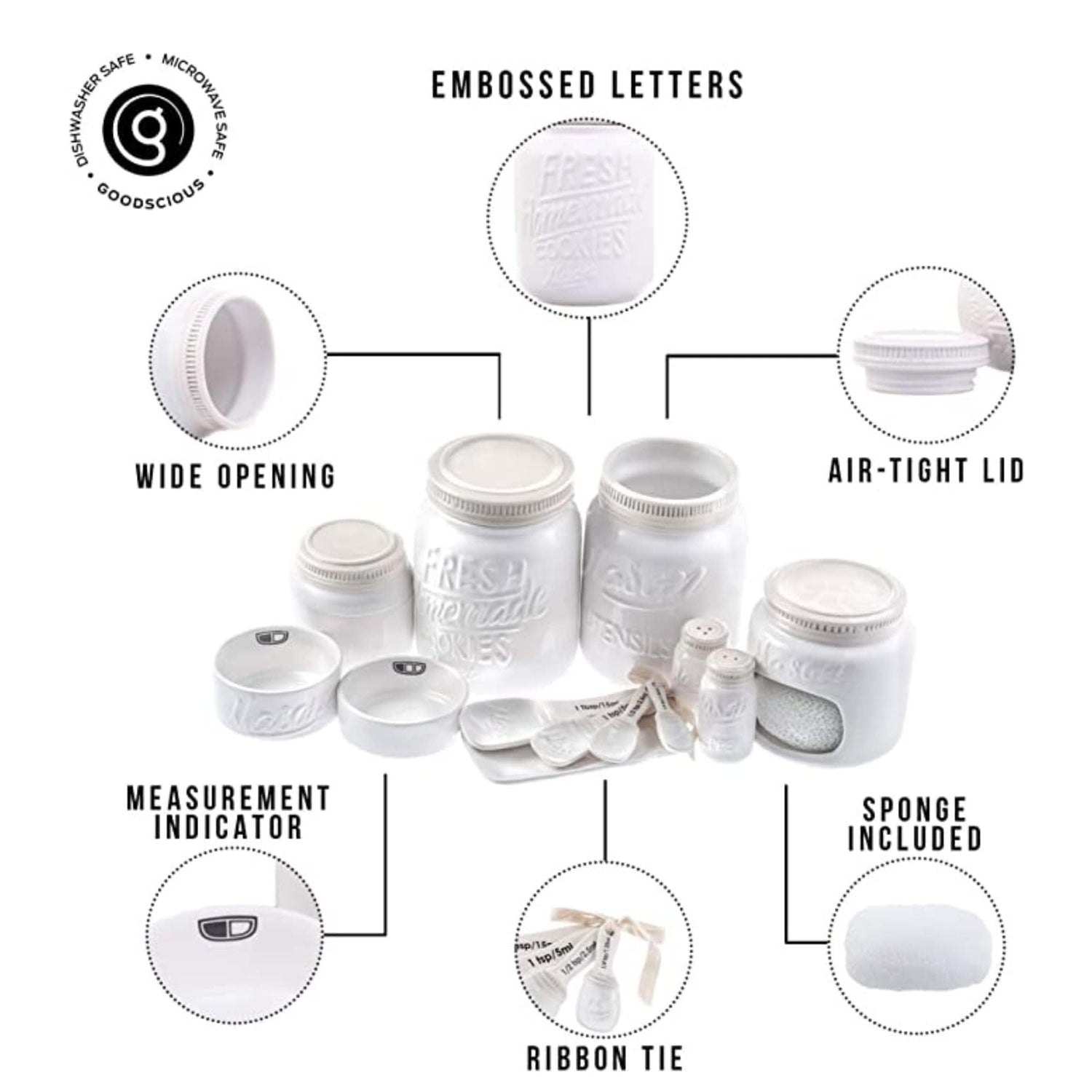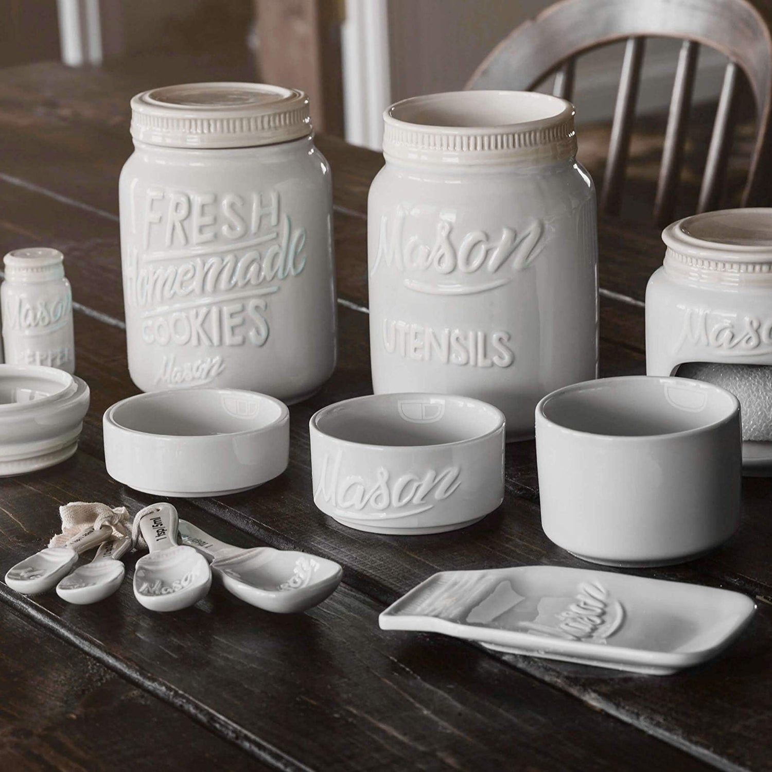Farmhouse Canisters Sets for the Kitchen - Mason Jar Ceramic Kitchen Utensil Holder, Spoon Rest, Cute Cookie Jar, Salt & Pepper Shaker Sets, Sponge Holder, Measuring Cups & Spoons (White,17-Pc Bundle)
