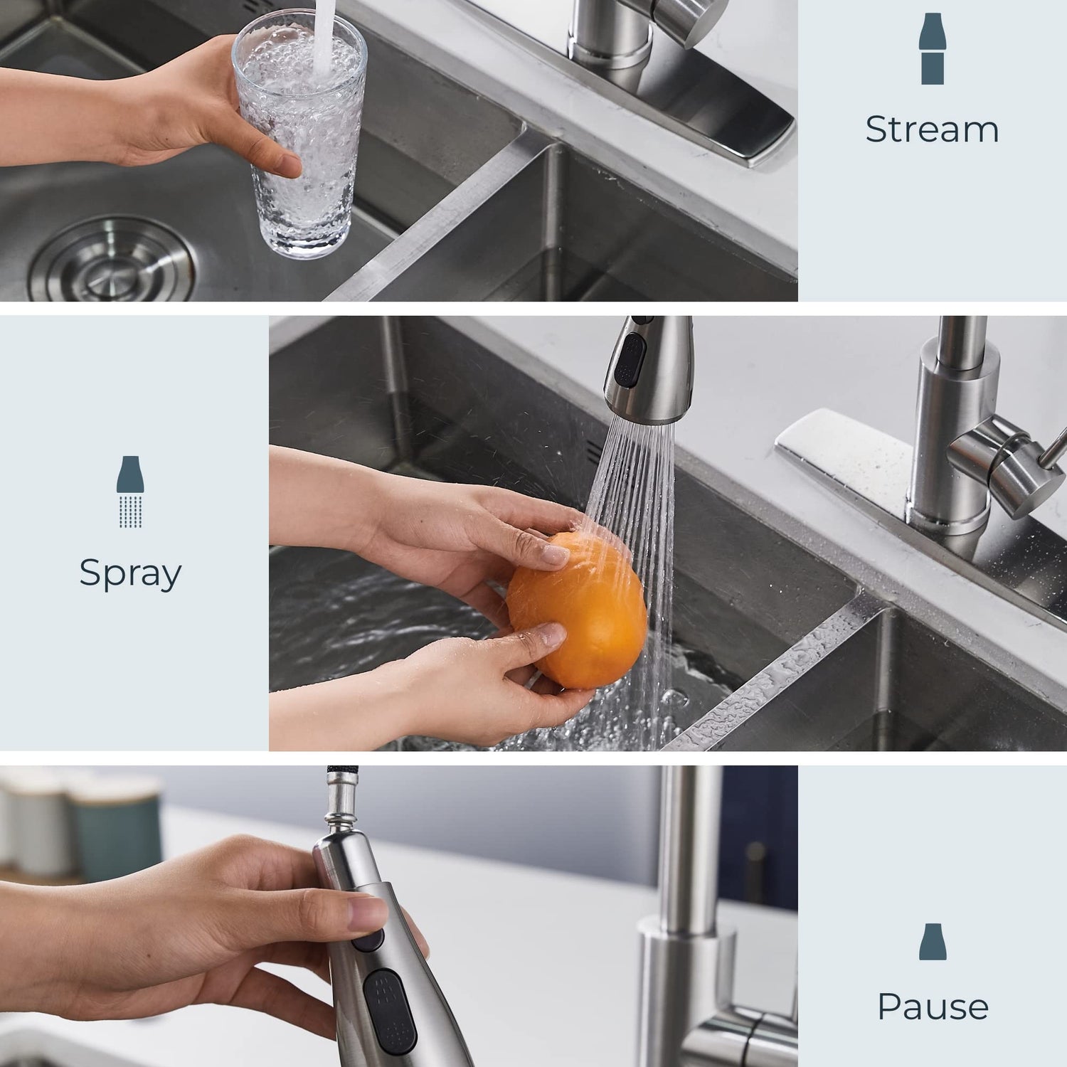 - Versatile Functionality: Our FORIOUS kitchen sink faucet combines three spray settings (Stream, Spray, Pause), a high arc, an 18 inch retractable hose, 360° rotation spray head, and a single handle for efficient sink coverage and effortless control