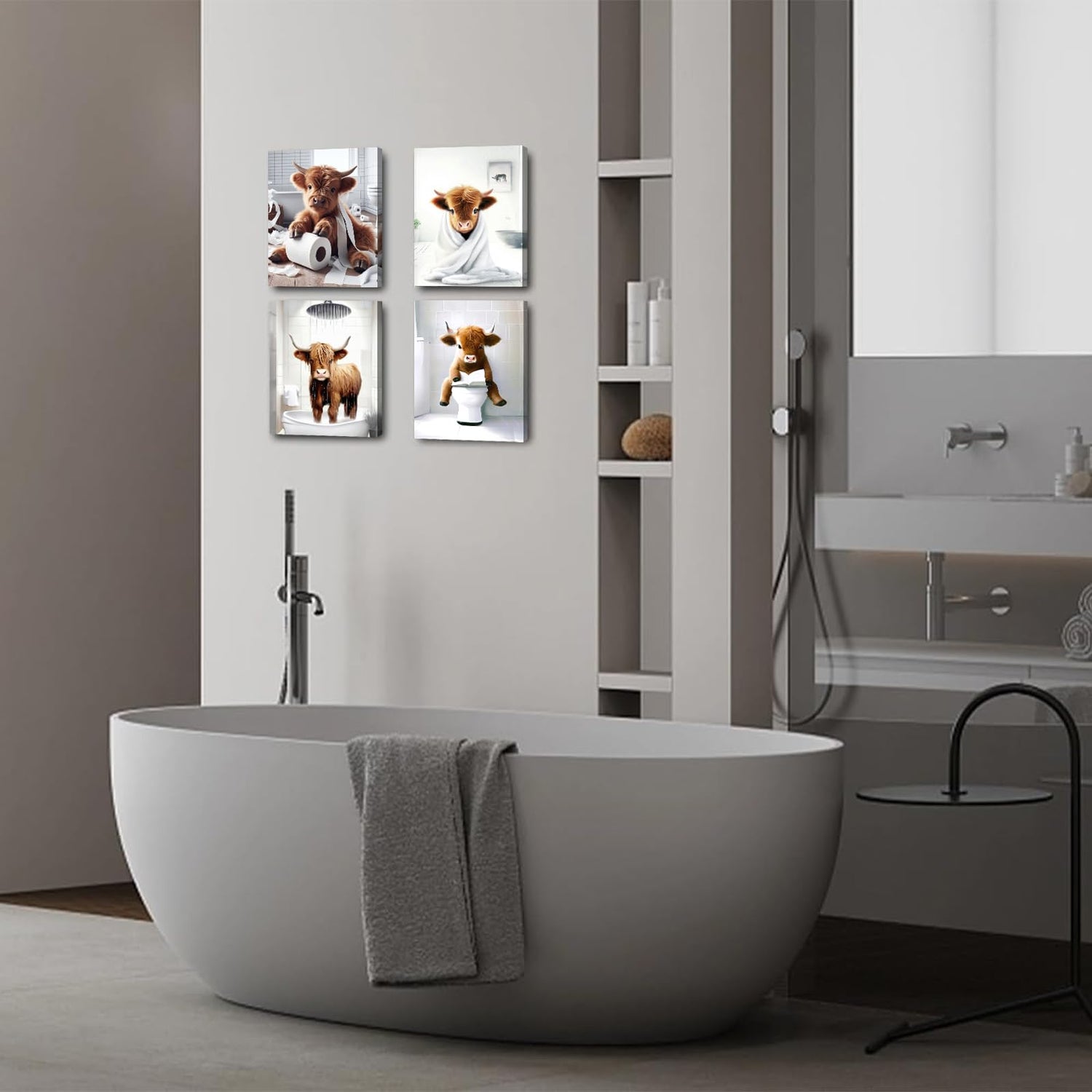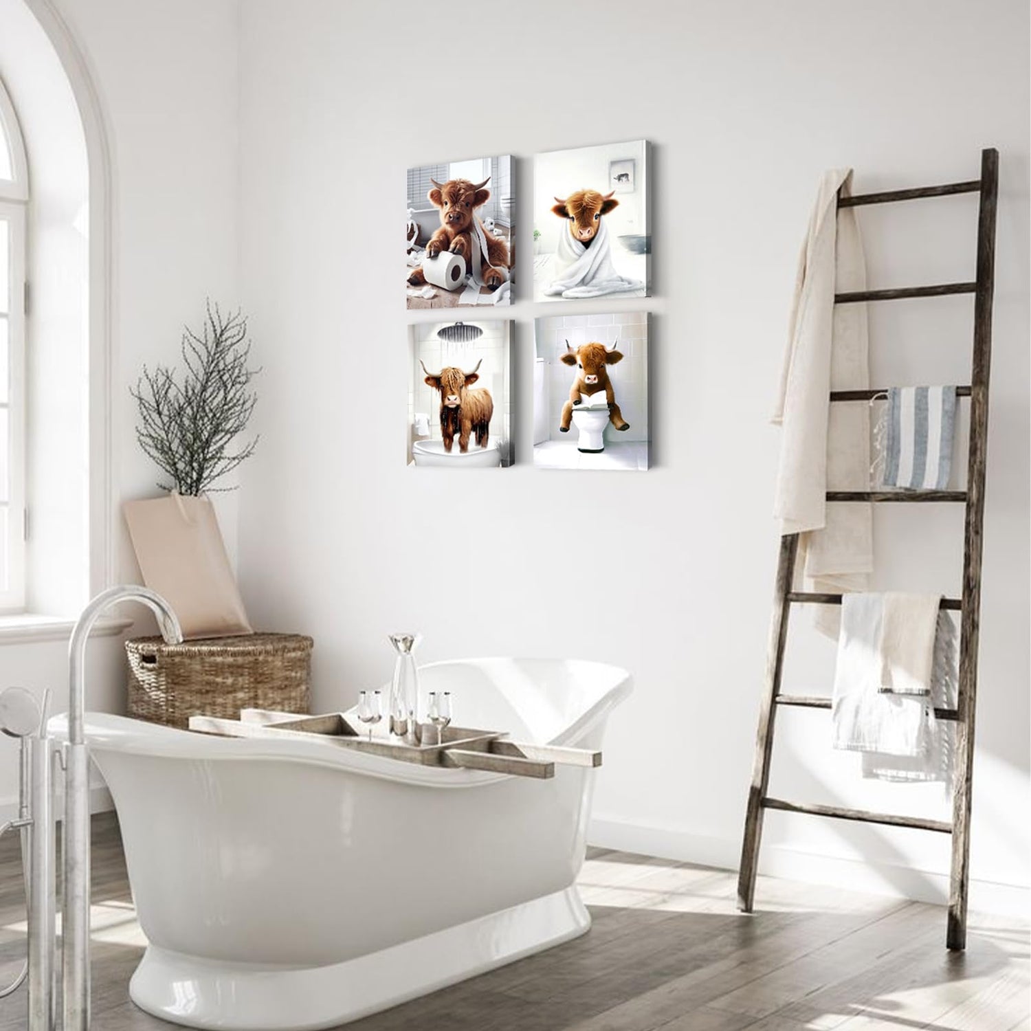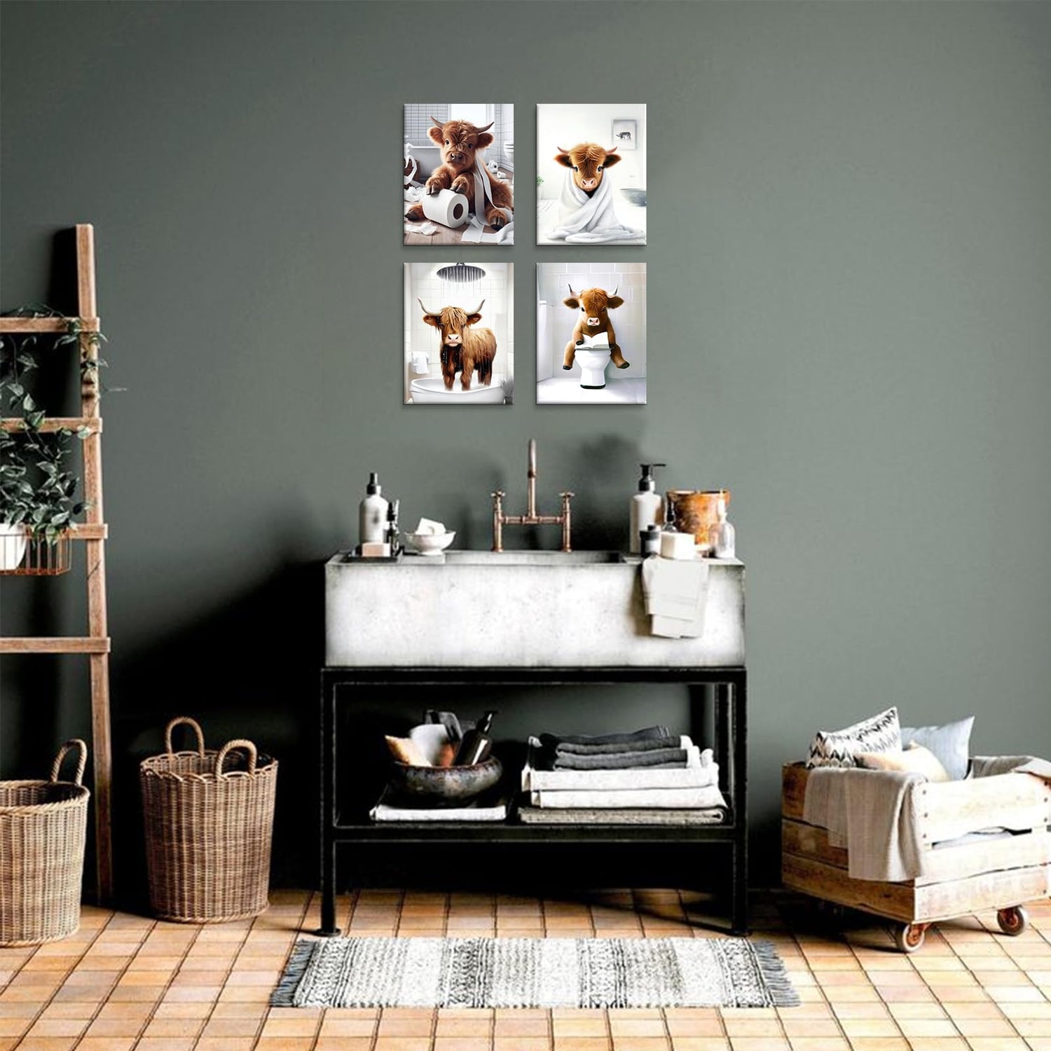 Framed Bathroom Decor Wall Art,Funny Highland Cow in Bathroom,Rustic Farmhouse Bathroom Wall Art,Funny Bathroom Wall Decor Signs,Cute Animal Art Prints for Bathroom(Framed,8x10inx4pcs)