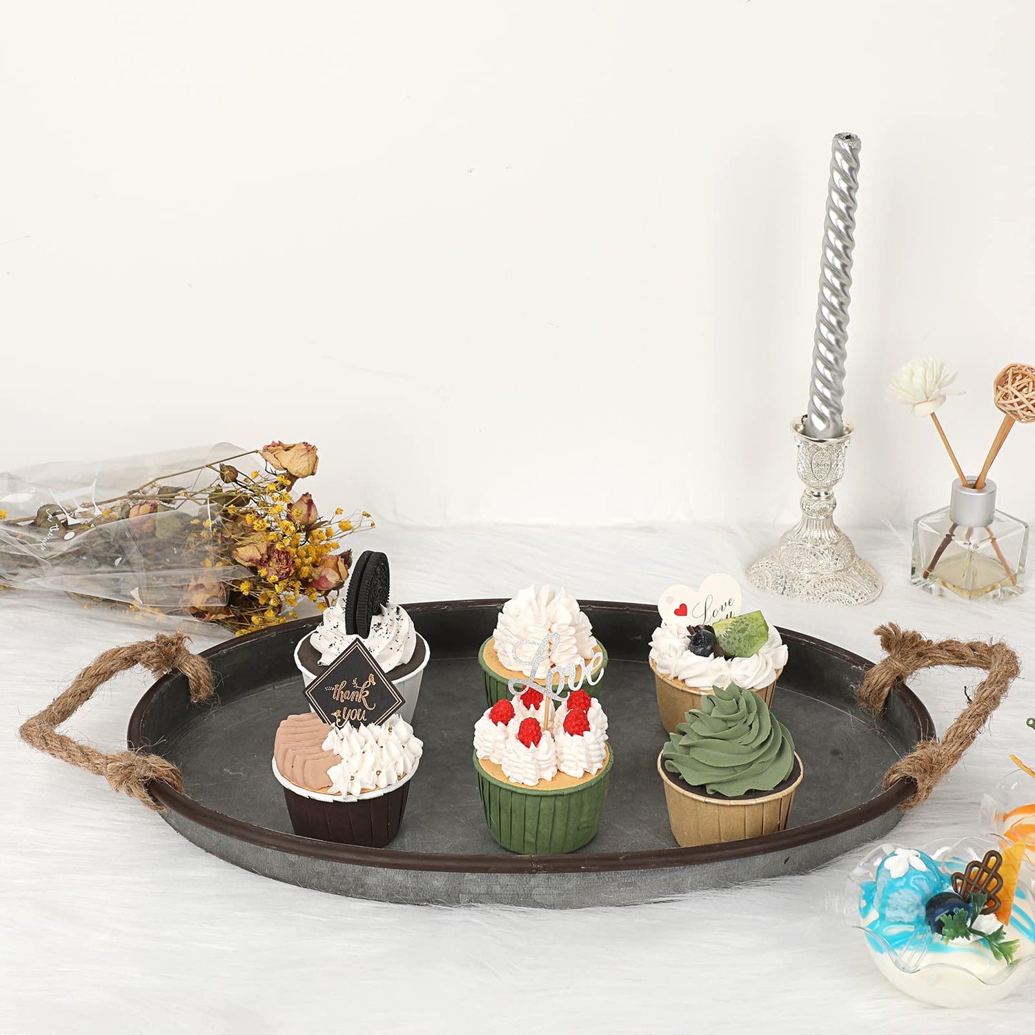 Hipiwe Galvanized Metal Iron Oval Tray with Rope Handle Farmhouse Serving Tray Rustic Industrial Decorative Centerpiece for Coffee Table Weddings and Parties Decor, Large