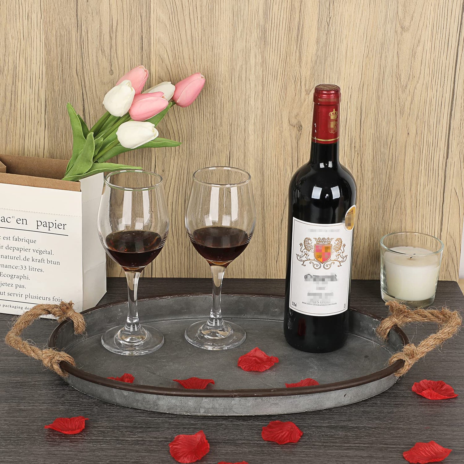 • Product Size- Metal Tray Leight: 15.6", Width: 9.8", Height:1.3"; perfect size as serving tray for parties or for breakfast. Package include:1 x Oval Metal Iron Tray(Accessories inside the tray are not included ,and you can't put food directly on this tray)