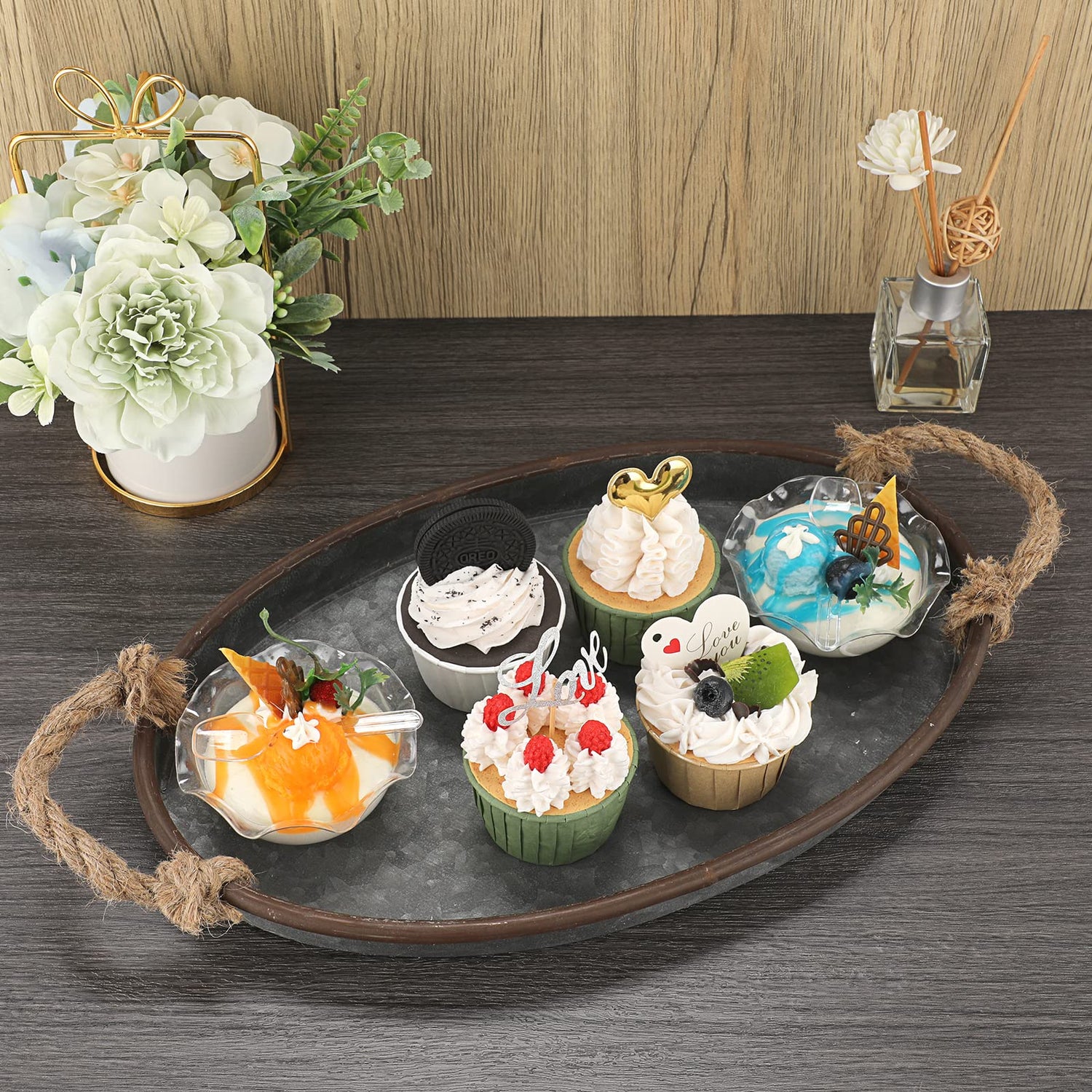 Hipiwe Galvanized Metal Iron Oval Tray with Rope Handle Farmhouse Serving Tray Rustic Industrial Decorative Centerpiece for Coffee Table Weddings and Parties Decor,Small