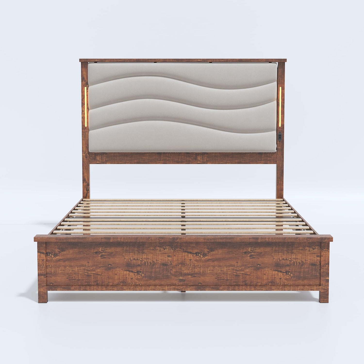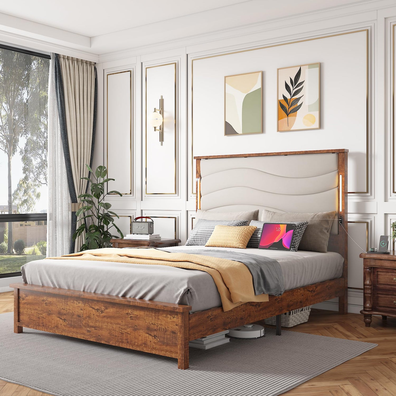Details: Holdolife Wooden Bed Frame with Tall Headboard, Rustic Farmhouse Bedframe with Led Lights and Charging Station, Wood Slat Support, Sturdy & Easy Assembly