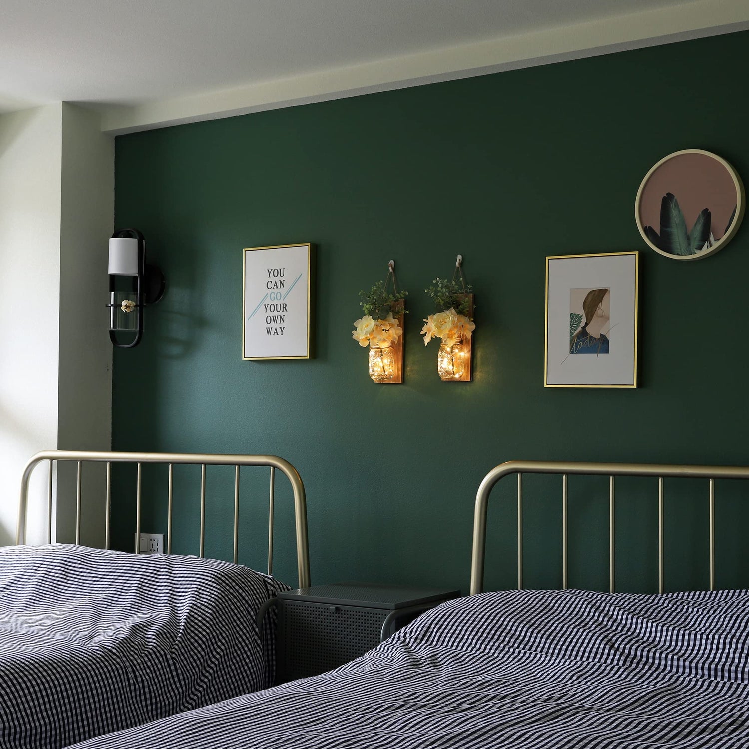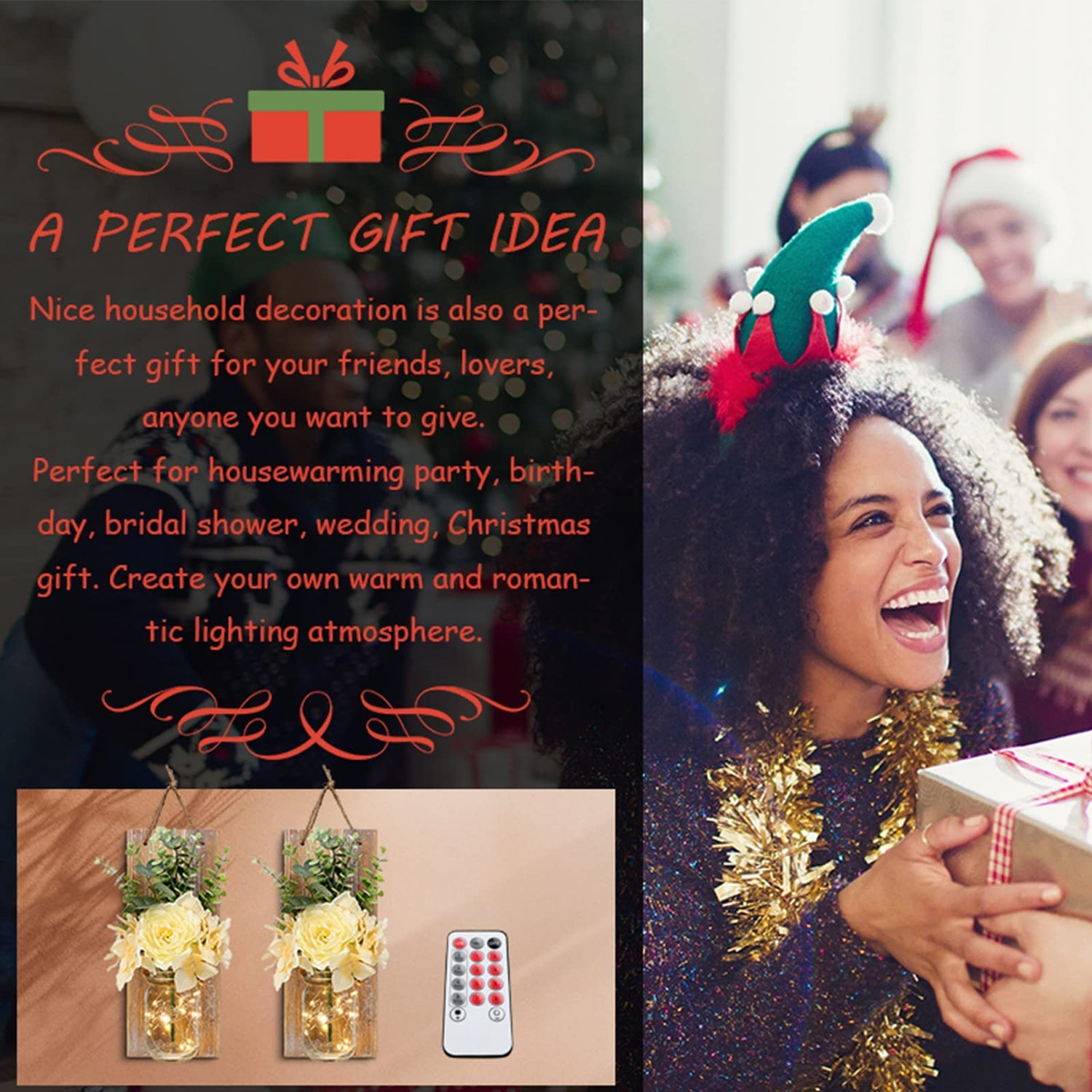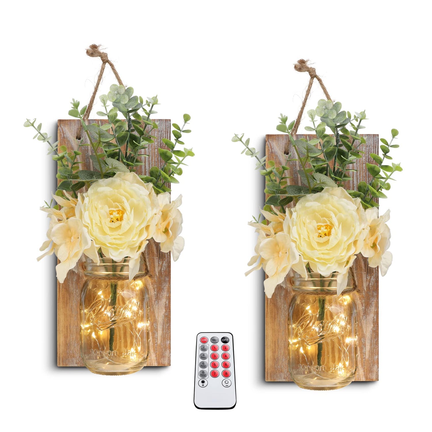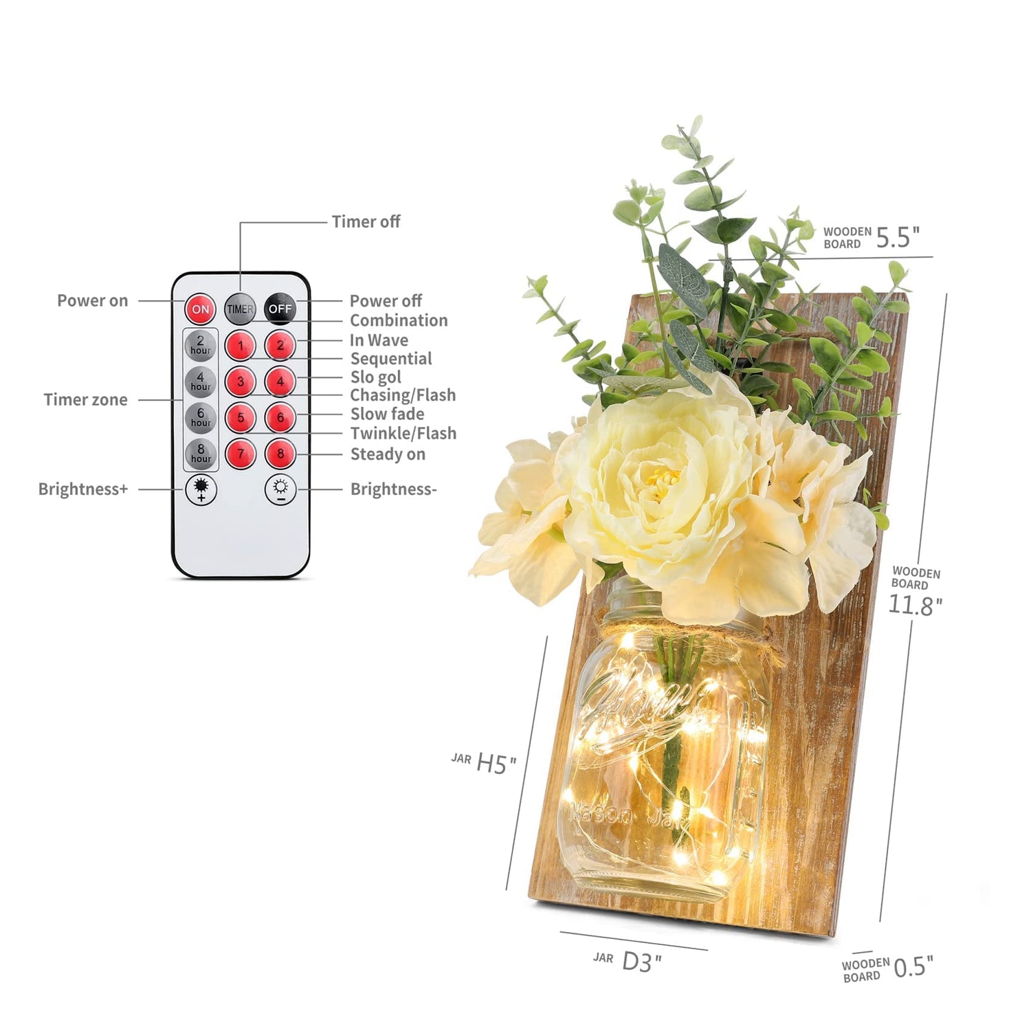 - 【Accessories】This Rustic Wall Decor includes 2 mason jars, 2 reclaimed wood,1 remote control, 2 strips of LED lights (without battery and not waterproof), and 2 bunches of flowers. (Please note that you need to install 3 * AA batteries)