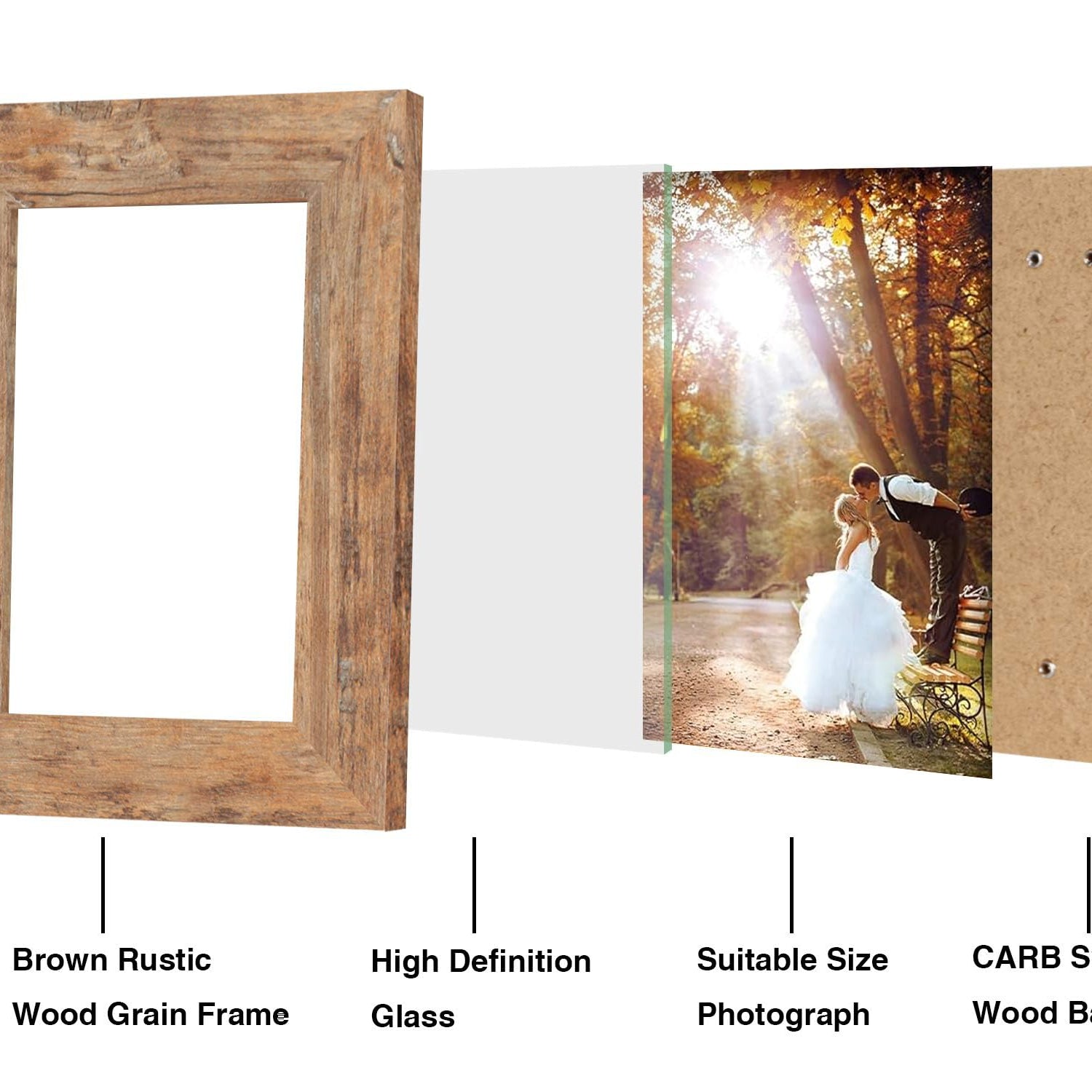iRahmen 5x7 Picture Frame Set of 4, High Definition Real Glass Rustic Brown Frame, 5 x 7 Wood Photo Frames for Tabletop Display and Wall Mounting