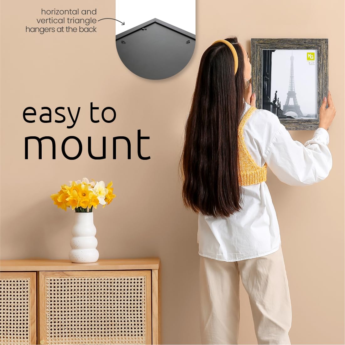 - Hangers on the back for vertical or horizontal wall display