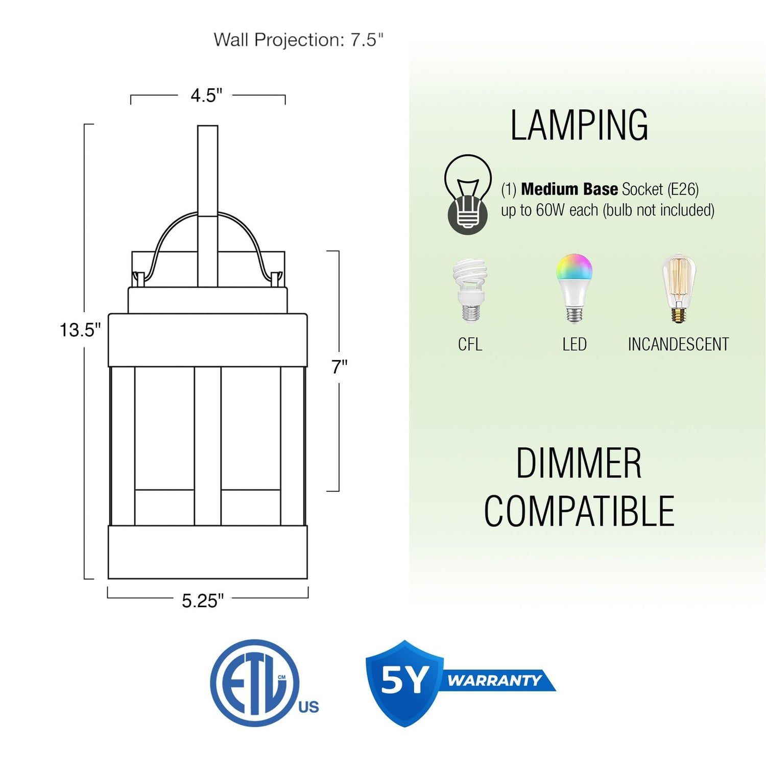 • [DIMENSIONS] 13.5" (H) x 5.25" (L) x 7.5" Wall Projection, Shade: 7.25" (H) x 4.25" (D), Backplate: 7" (H) x 4.5" (L)